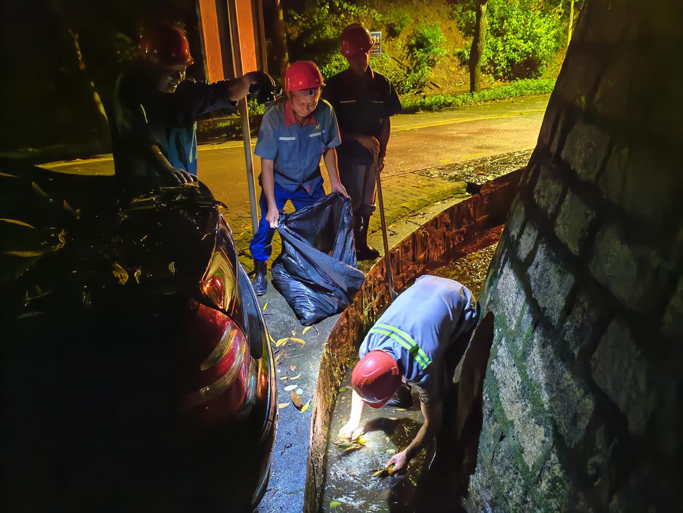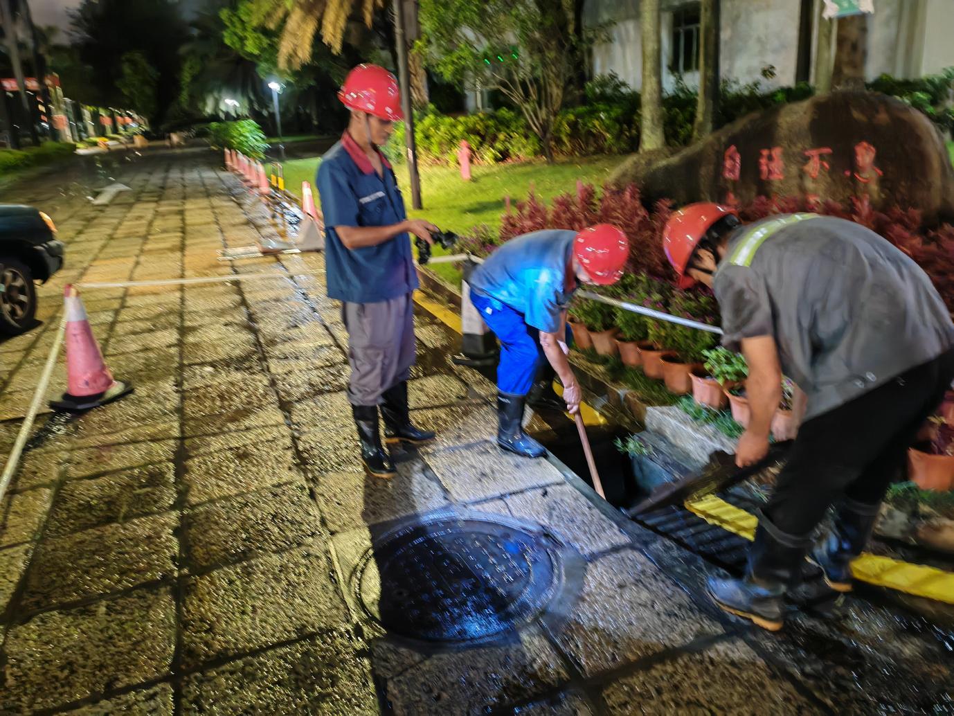 此外,应急抢险队在夜间加强巡查检查,及时清除排水沟、雨水井淤积的落叶、泥沙及其他杂物,保障排水顺畅,以免发生内涝。