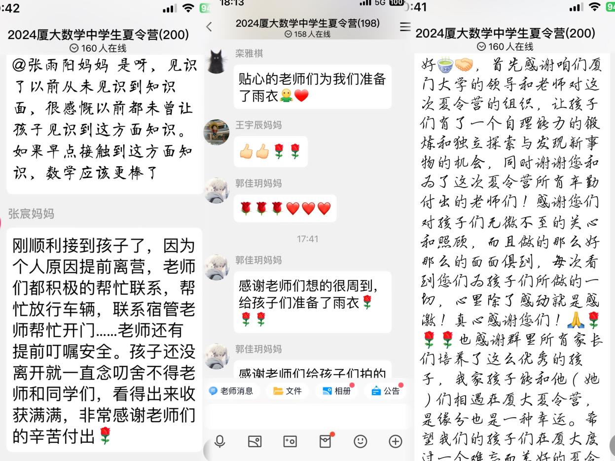 “消费卡丢了,马上启用备用卡”“下雨了,没事,我们有准备雨衣”“高温天气,联系餐厅提供绿豆汤,还有孩子们喜欢的冰可乐”……后勤保障无定时,时时皆用情。活动期间,有位学生突感身体不适,中心主任周亮亲自送他前往翔安医院就医,学生家长说:“有厦大老师在孩子身边,我们很放心”。数学夏令营闭营当天,受台风“格美”登陆影响,部分学生因列车停运无法按时返程,在学院的沟通下,这部分学生继续在校区“留宿”,我们也坚守“最后一班岗”,做好他们的住宿管理和乘车接送,直至学生安全回家。