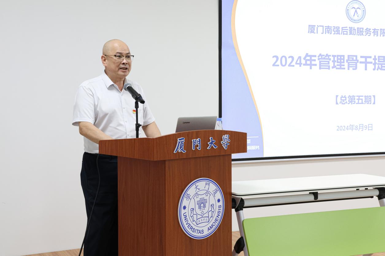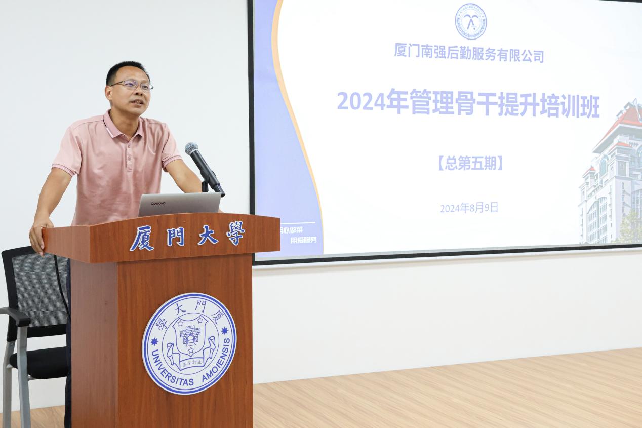 厦门南强后勤服务有限公司总经理罗阳在开班仪式上作开班动员讲话,他回顾了往年四期内训班取得的成效和公司2024年上半年文化建设和业务工作各项成果,肯定公司全体员工凝心聚力、积极奋进的良好工作氛围,特别是在面临各类困难和挑战中,能够精诚团结,万众一心,以积极昂扬的精神风貌迎难而上,最终化险为夷,战胜困难,再次取得社会效益与经济效益的双丰收。他要求全体骨干珍惜本次培训机会,严肃出勤纪律,认真学习总结,鉴往知来,砺行致远,学有所获,不断提升自身核心竞争力。