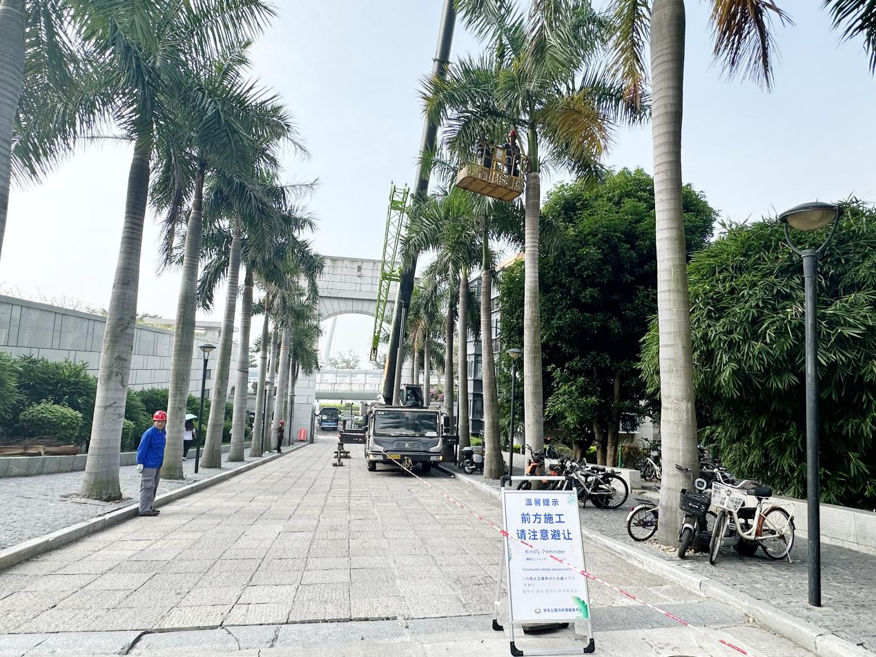 此外,为保障迎新工作安全有序进行,绿化保洁部提前对校园内树木进行排查,发现隐患树木及时处置,其中针对大王椰子树枯叶掉落的问题,绿化保洁部调度高空作业车进行了枯叶清除、树干叶柄绑扎等安全处置工作。