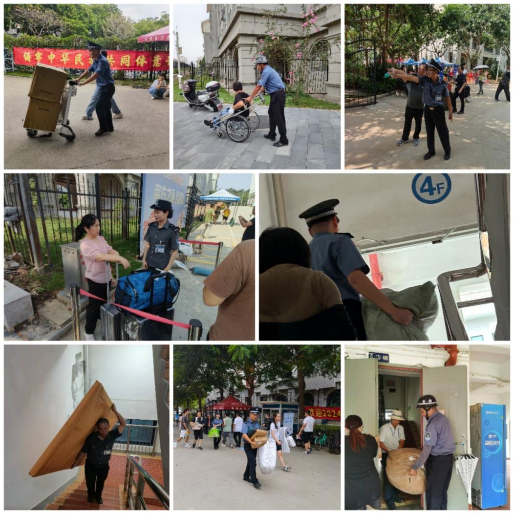 安防组在为期三天的迎新工作中迎来送往上万人次的学生及家长,回答问题、搬运行李、护送行动不便的学生、拾金不昧、帮助生病的学生及家长等好人好事数都数不过来。安防队员们牢记自身使命,以高度的责任心和热情一一为学生及家长们解决在园区内出现的问题。