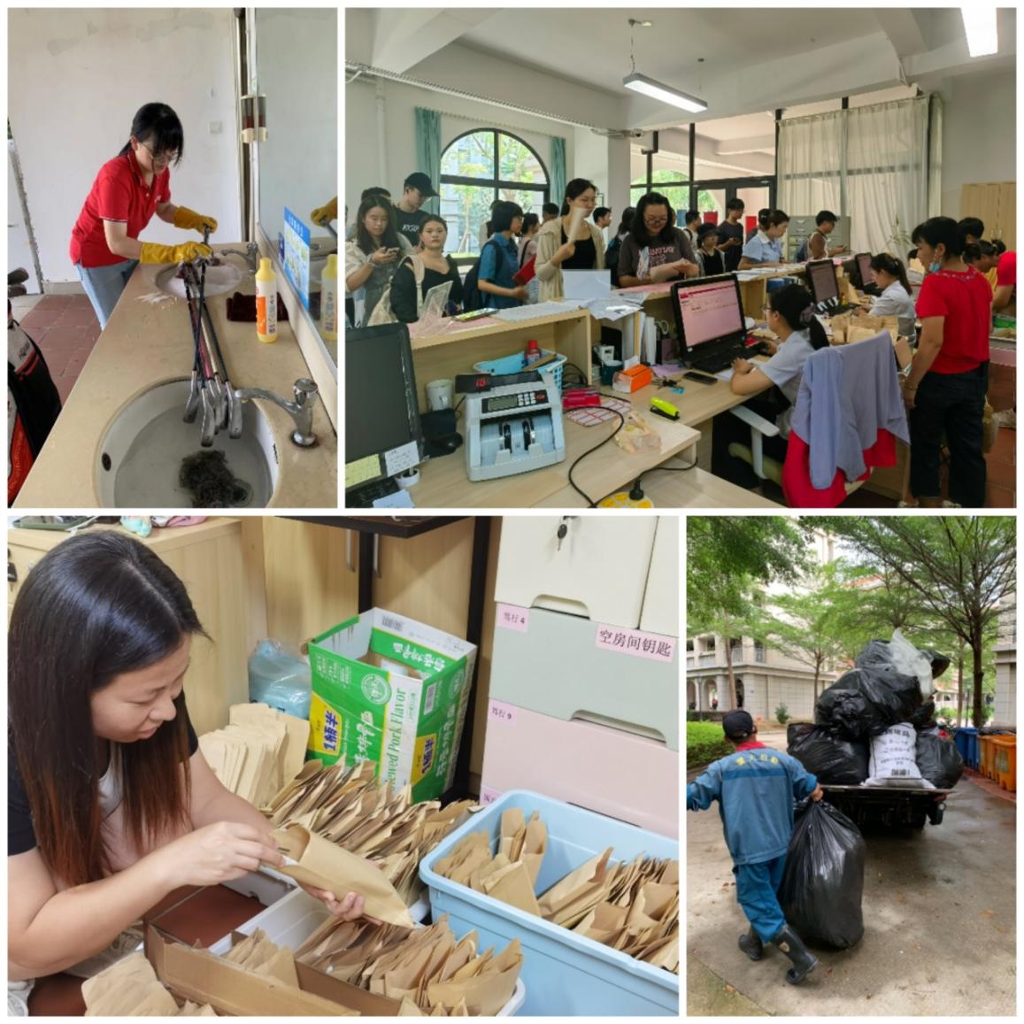 迎接新生入学是厦门大学一年一度不可或缺的重大活动,校园服务部的全体员工按照翔安校区服务办的工作部署,全力以赴投入这一活动。安防组提前布置迎新安防工作,场馆组提前进行场馆维护及员工安全培训,绿化组提前绿化施工养护,宿舍组提前安排宿舍粉刷修缮350余间,公共区域粉刷涉及1-4期学生公寓近420处,维修及清洗家具、水电设施、电器3000余件/台,并且对所有宿舍进行了全面的保洁维护。