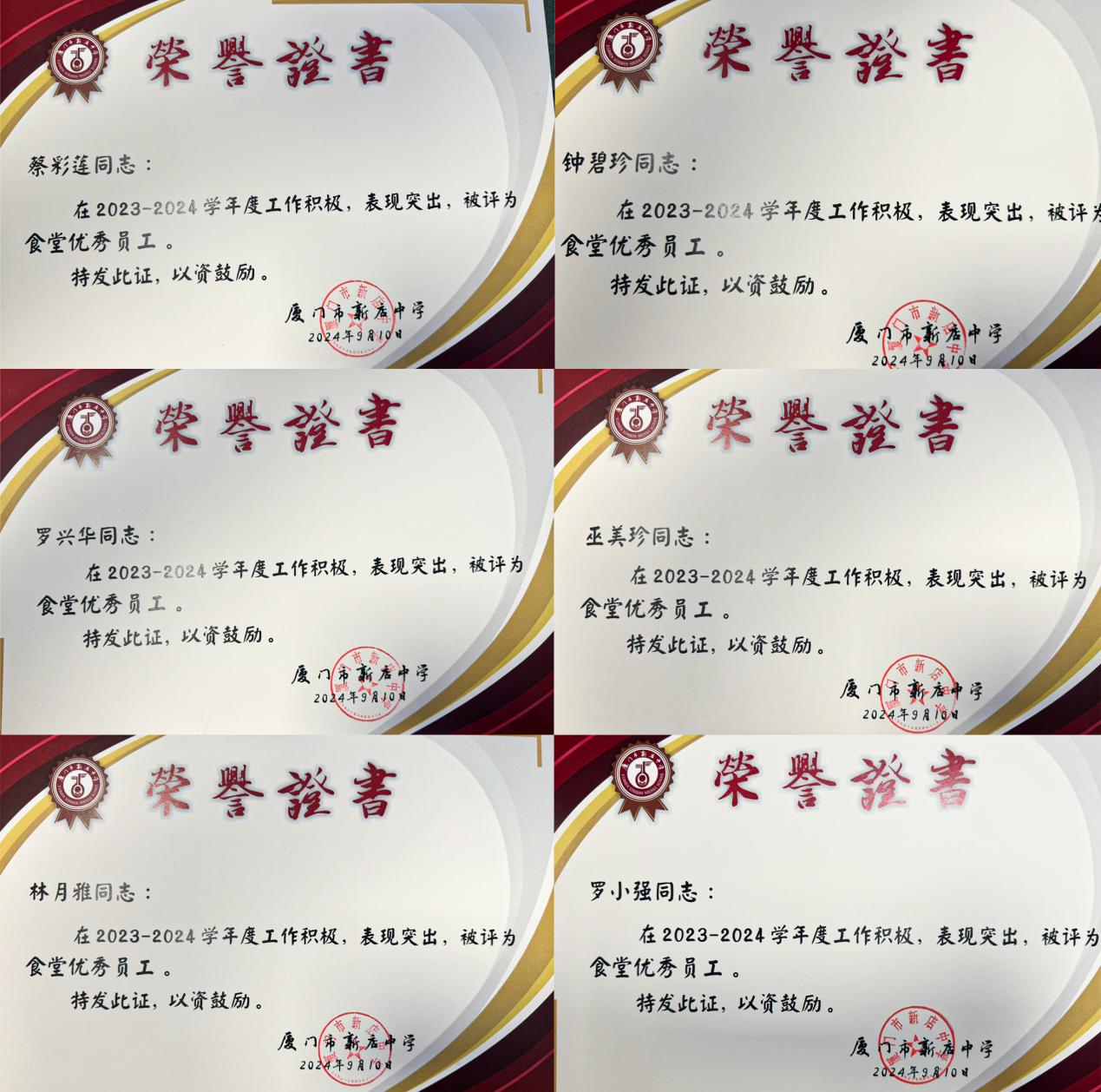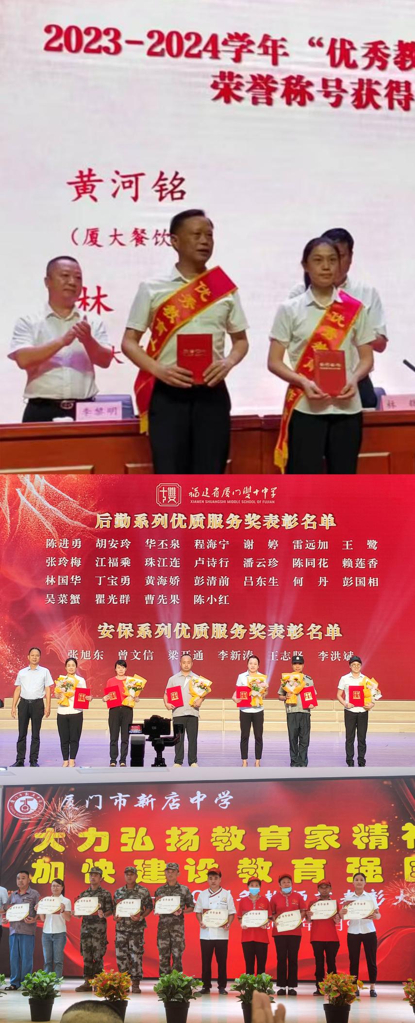 值此节日之际,厦门医学院、厦门双十中学、厦门市新店中学在优秀教师表彰大会上,为日常辛勤服务广大师生的“厦大餐饮”人予以表彰,授予黄河铭“优秀教育工作者”称号;授予陈进勇、胡安玲、谢婷、雷远加“后勤先进个人”称号;授予钟碧珍、罗小强、林月雅、巫美珍、罗兴华、蔡彩莲“食堂优秀员工”称号。以此表达学校对“厦大餐饮”人勤恳奉献、优质服务的认可和鼓励!