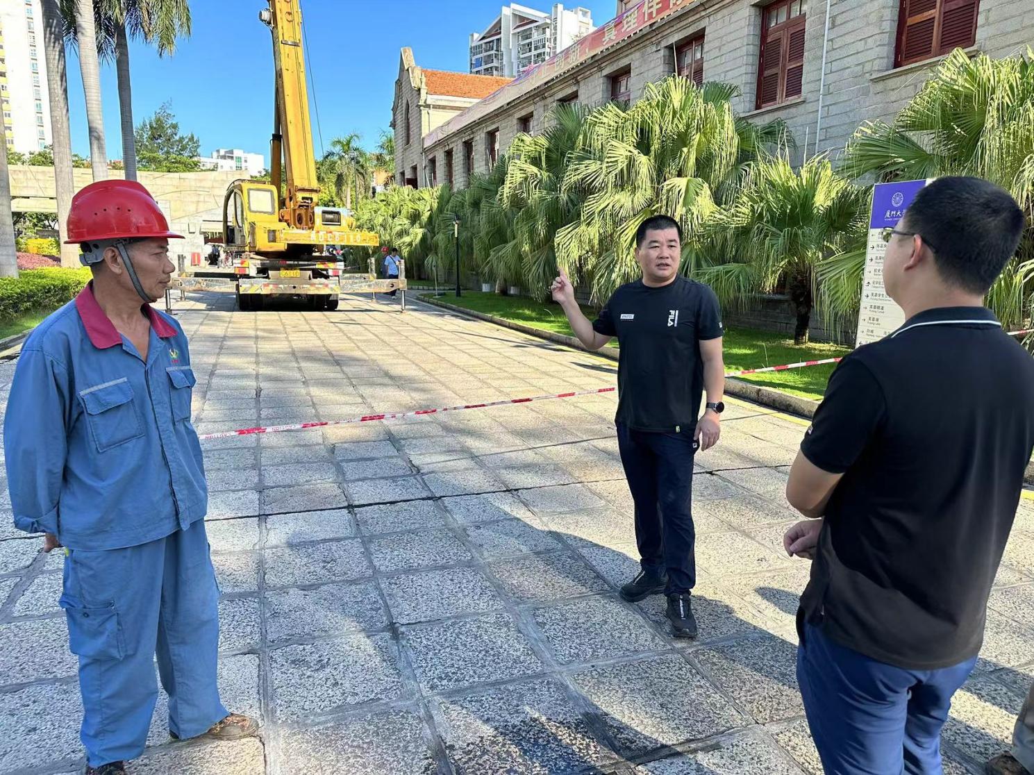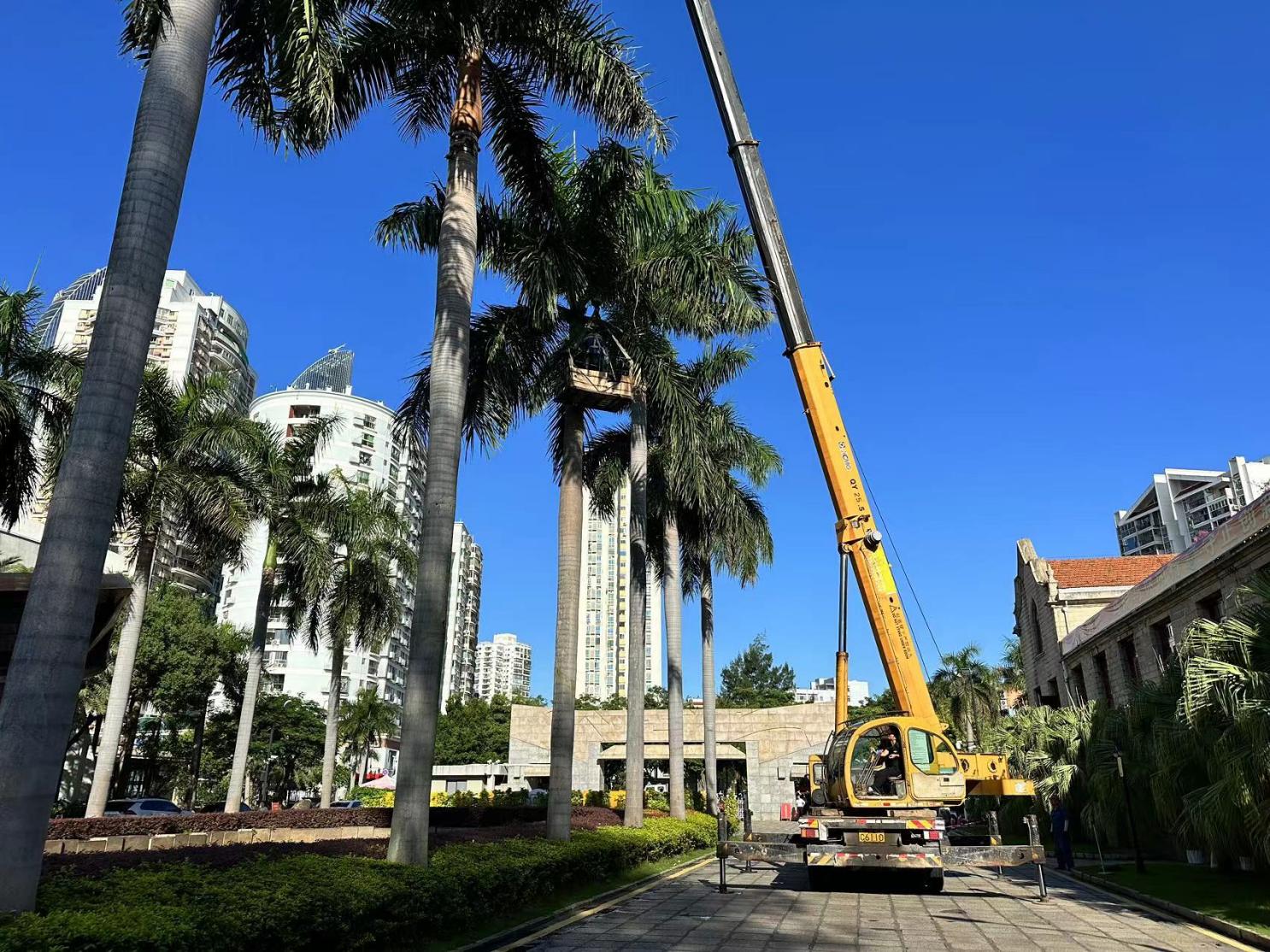 为保障校园环境安全,绿化保洁部细致排查树木安全隐患,加固隐患树木。针对校园内部分树木出现的干枯枝条掉落现象,部门组织班组骨干进行专项处理,使用高枝杆、吊车等机械对高空挂枝进行修剪清理,同时对西校门大王椰子的冠部捆绑扎带,在维持优美树型的同时防范叶片掉落砸伤行人。
