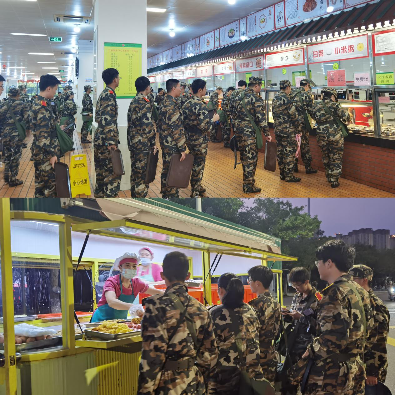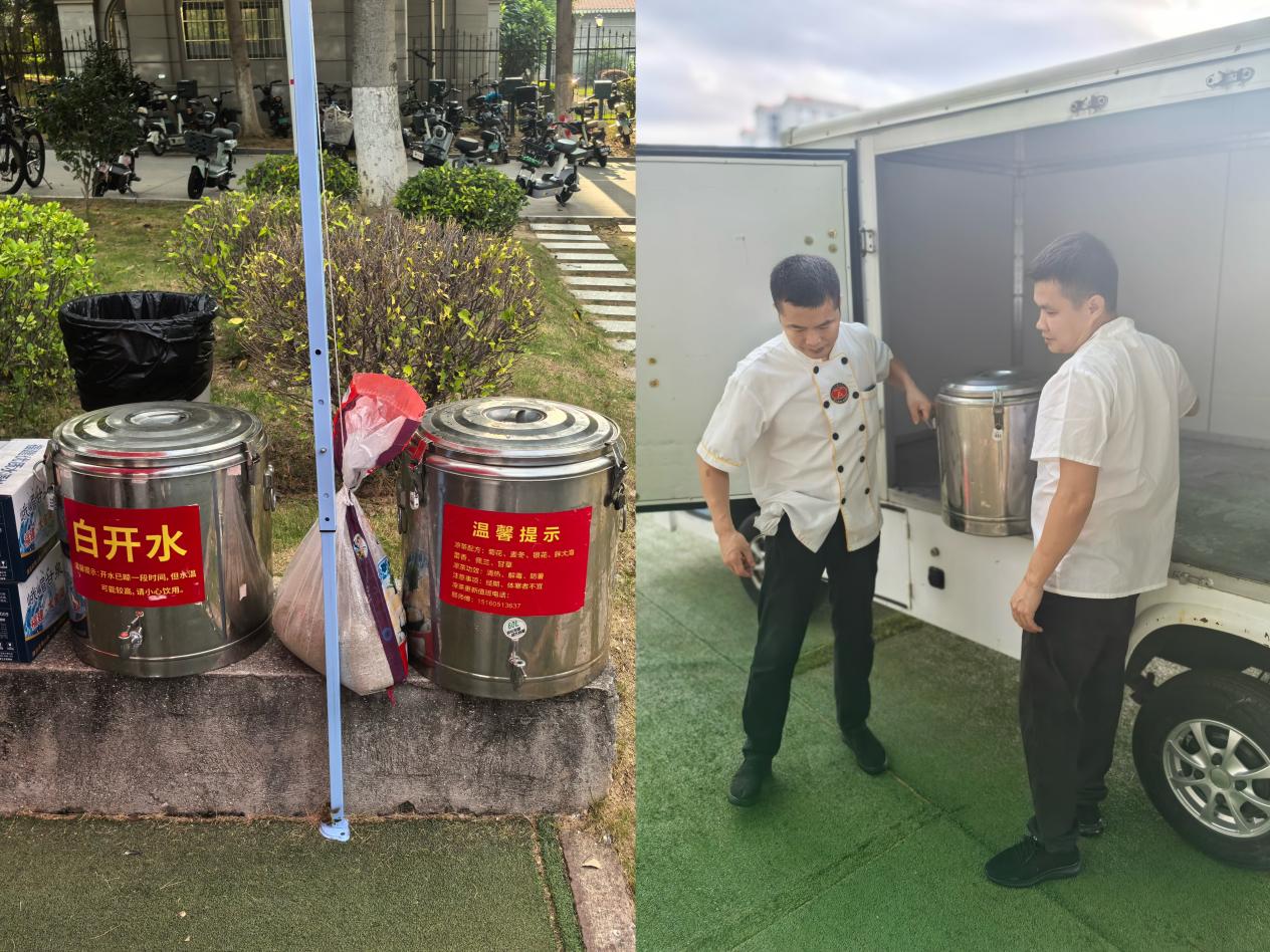 餐饮部根据军训作息时间灵活调整供餐时间,并精心策划,提供营养均衡、口味多样的菜肴,全力做好军训期间的餐饮服务。丰庭餐厅承接军训教官用餐,为教官提供丰富多样的自助餐,教官可以根据自己的口味灵活选择,受到教官的一致好评。同时,餐厅还贴心地在训练场地边提供凉茶和温水,确保参训人员可以及时补充水分,恢复体力,为学子们的军训生活增添关怀与温暖。此外,为做好军训拉练供餐保障,各餐厅在9月9日将餐厅开业时间提前至上午五点,并在主楼广场两侧设置移动餐车,确保参训人员能够在紧张的训练开始前,及时补充体力,以最佳状态迎接挑战。