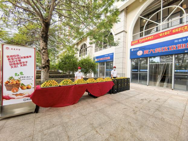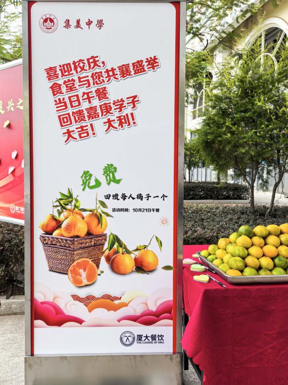 校庆当日午餐,集美中学侨英校区食堂感恩回馈,贴心地准备了充满美好寓意的橘子,并由“厦大餐饮”的餐厅工作人员亲手送到师生手中,表达心想事“橙”、马到“橙”功的美好祝愿。