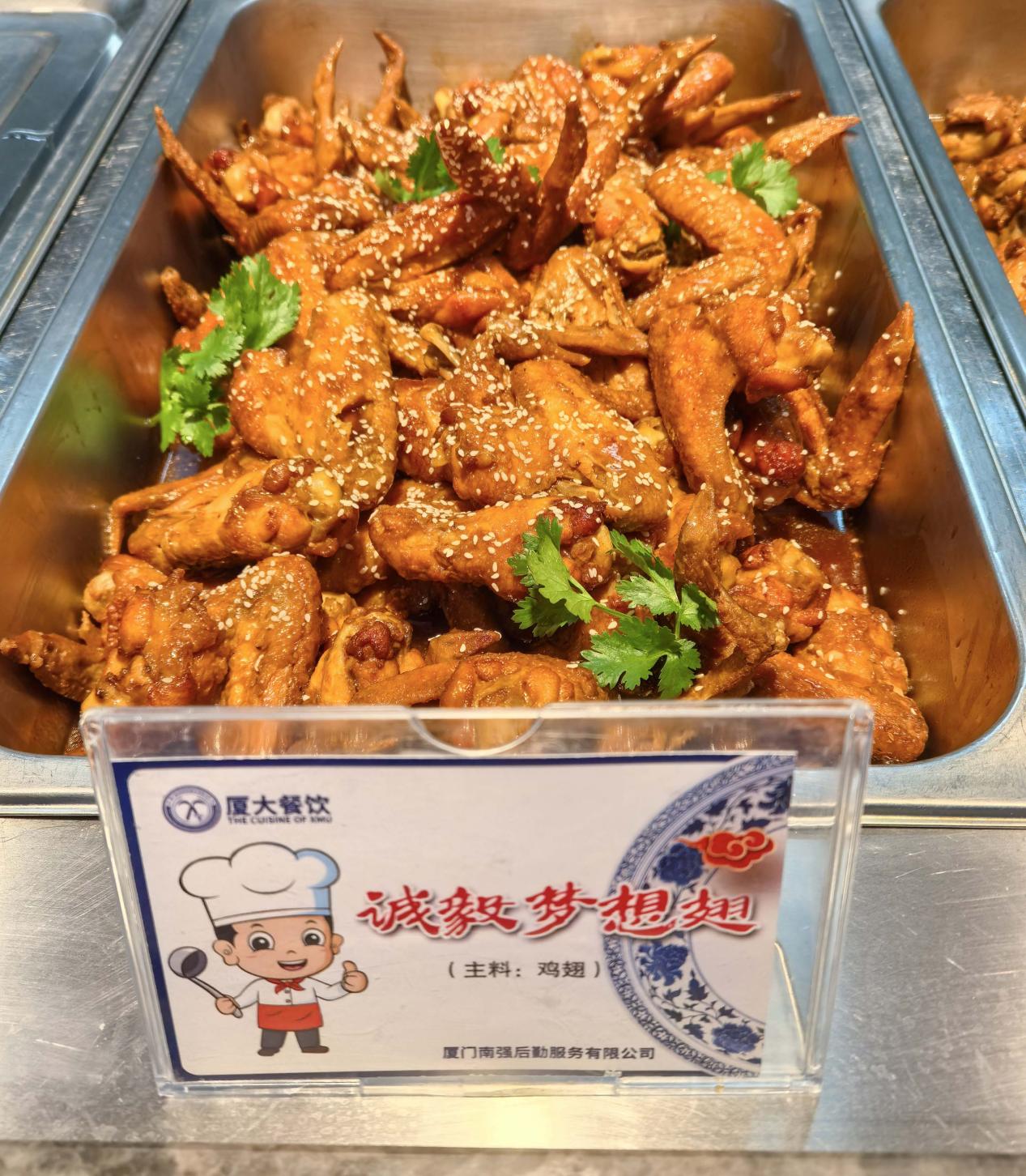 诚毅梦想翅——诚毅诚毅,诚实守信、坚韧不拔。翅膀象征梦想与飞翔,这道菜品饱含“厦大餐饮”人对集美中学学子心怀梦想、展翅高飞的美好祝福。