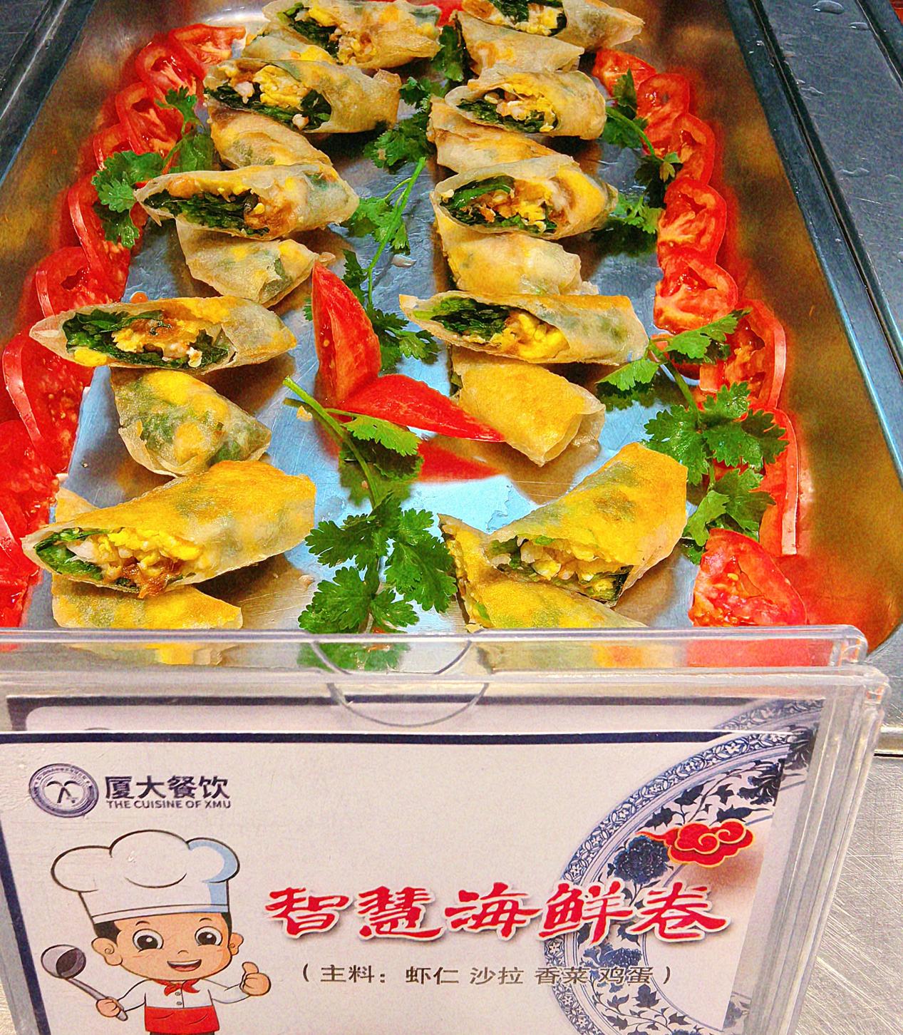 智慧海鲜卷——海鲜与素菜相融合,富含营养,象征智慧与才华;春卷寓意着新学期的开始,“厦大餐饮”人祝愿嘉庚学子们在新学期里学业有成,祝愿学校再创辉煌。
