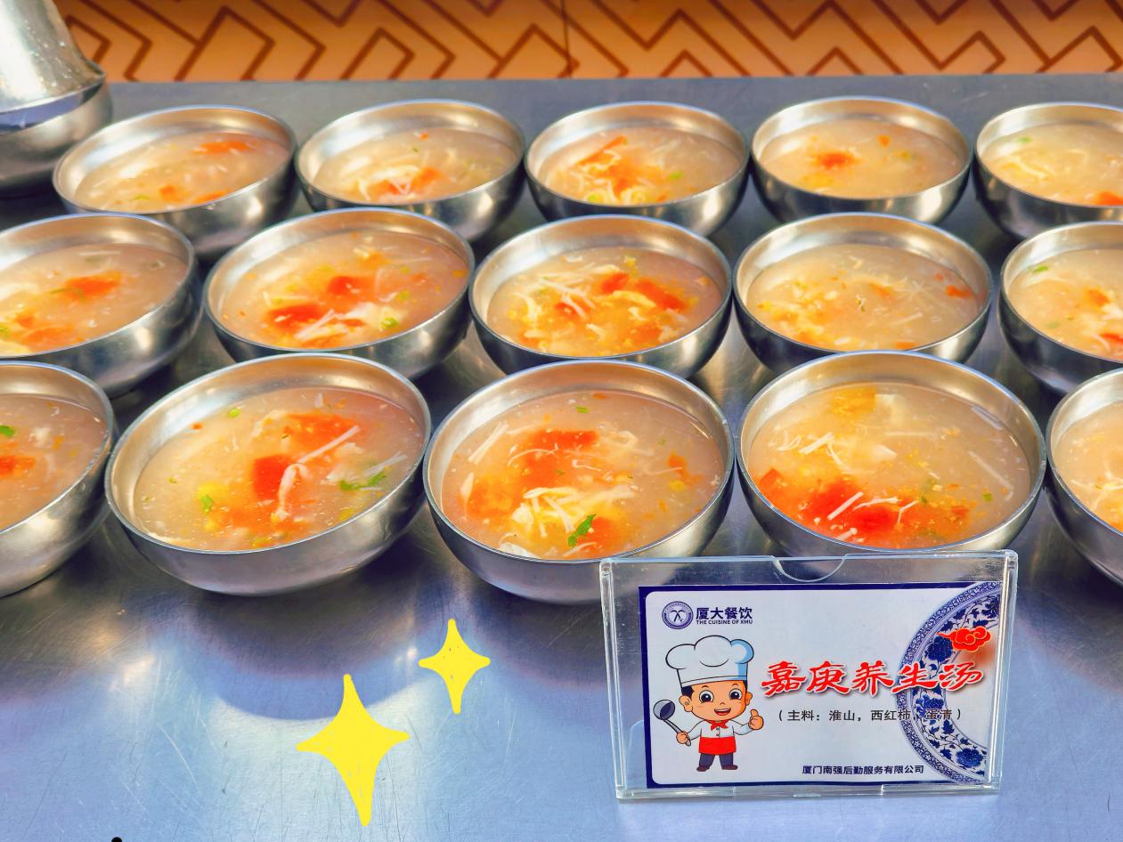 嘉庚养生羹——食堂选用淮山、西红柿、蛋清熬制成一碗碗热腾腾的羹汤,寓意着母校对学子们身心健康的关怀与祝福。