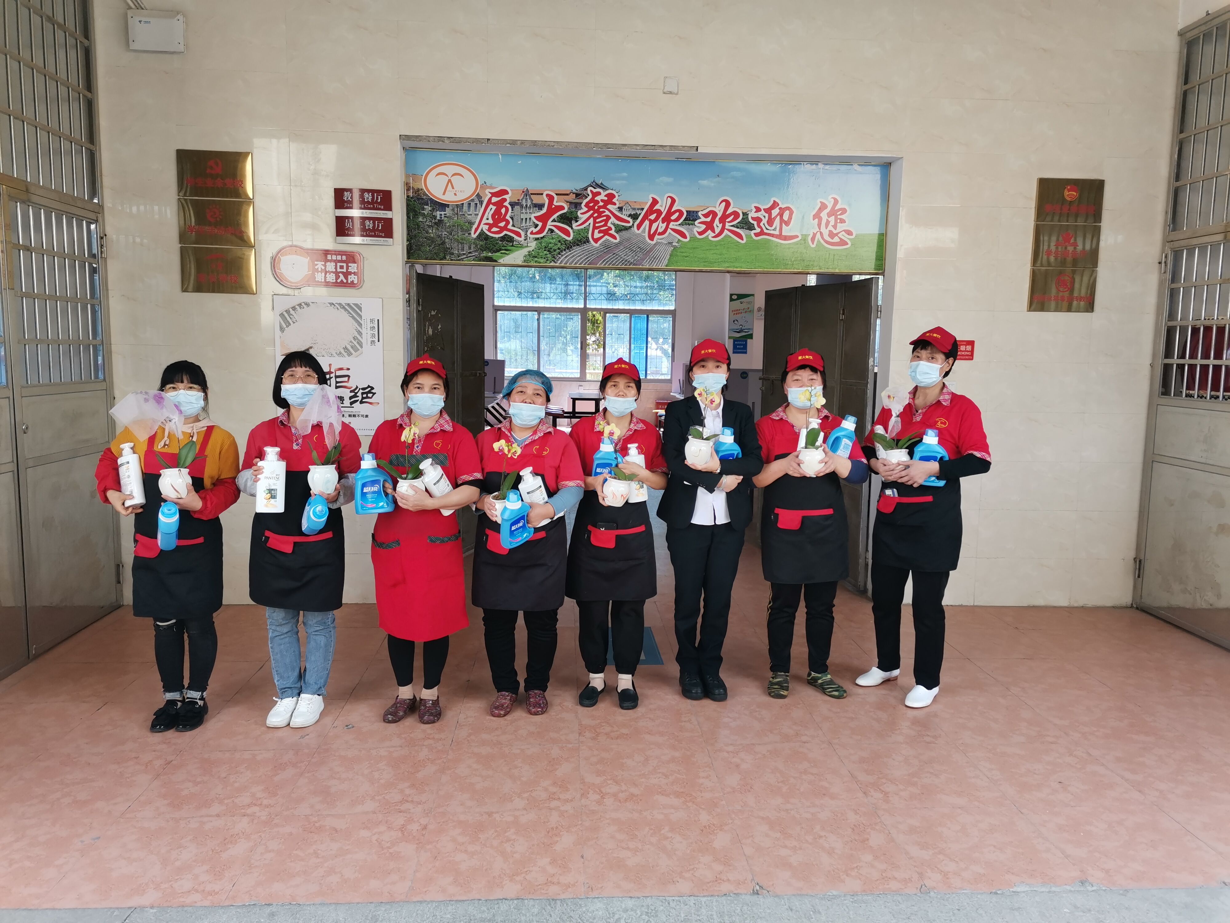 春水初生,春林初盛,春风十里不如你!节日当天,南强后勤公司(厦大餐饮)多家餐厅还积极与学校和企业开展互动,为老师们提供水果茶、鲜花、蛋挞、银耳羹、盆栽等妇女节小礼物,为企业员工奉上康乃馨、玫瑰、养乐多等节日祝福,举办插花等活动;老师们也为餐厅后勤人员献花,表达对“厦大餐饮”优质服务的肯定与谢意,大家共享女神节的欢乐!
