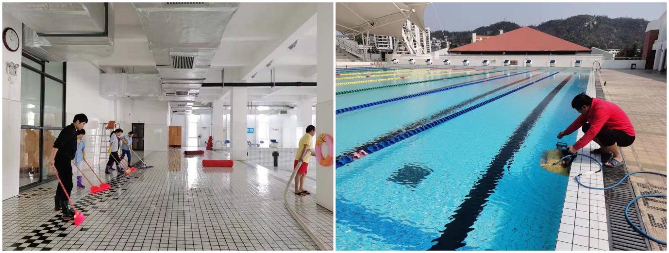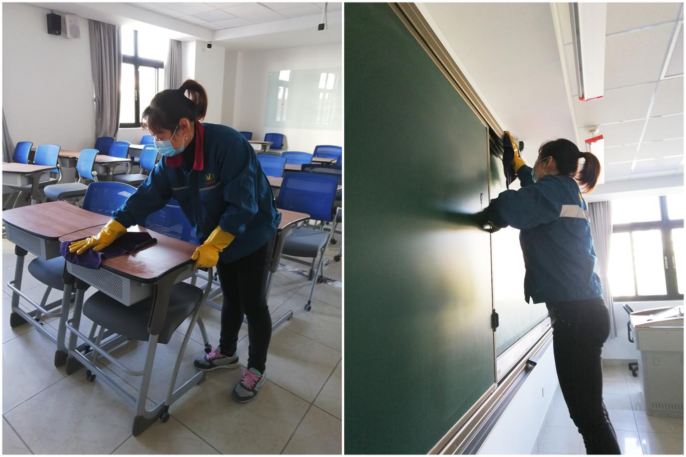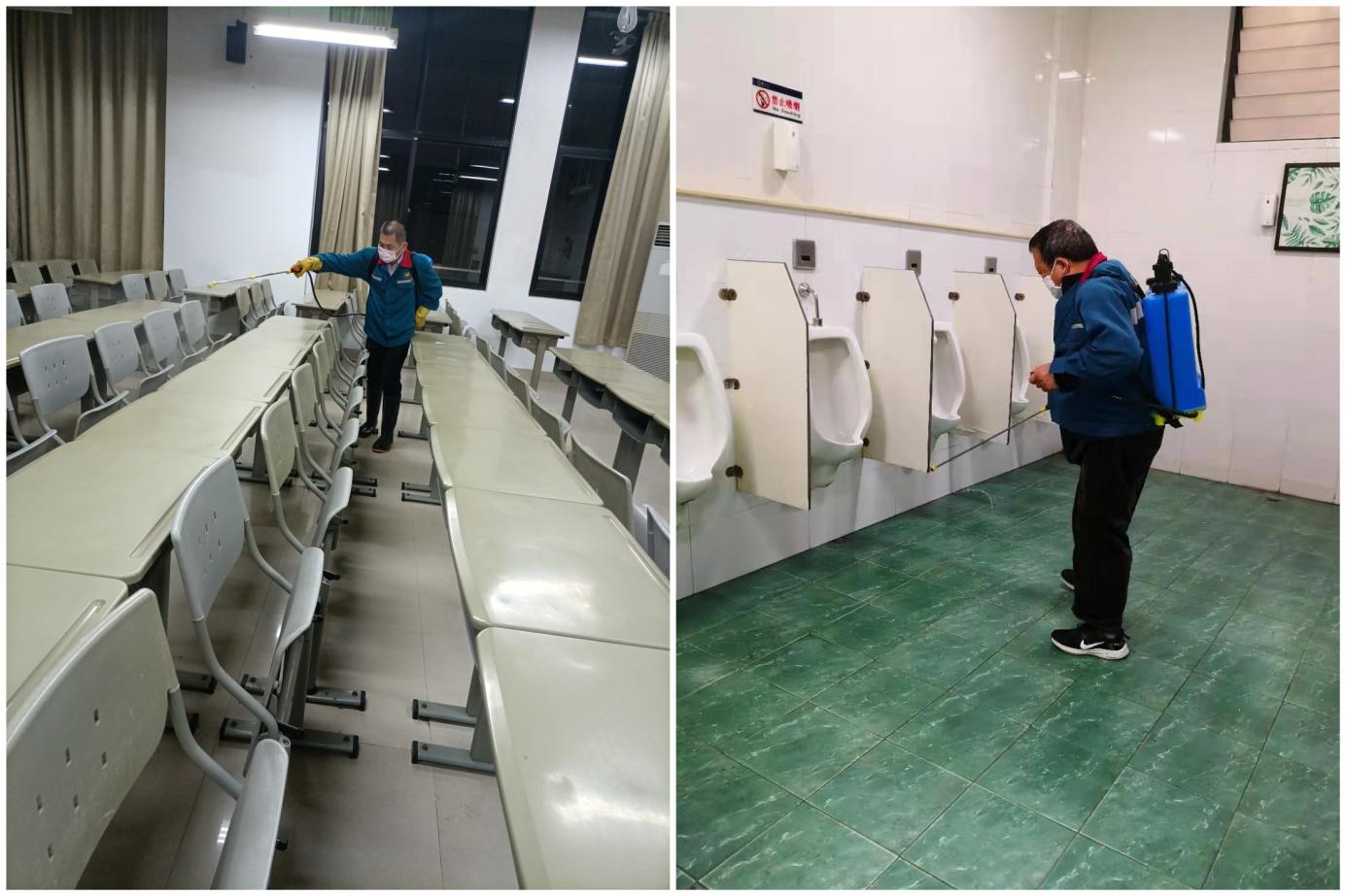 学生返校前,学生公寓与环境服务中心组织对学生宿舍、公教、场馆、校园环境等进行卫生大扫除、防疫消杀,对宿舍、公教、场馆的设施设备进行检修,还根据疫情防控要求在校门、宿舍设置了留观区,并做好充足的防疫物资储备。