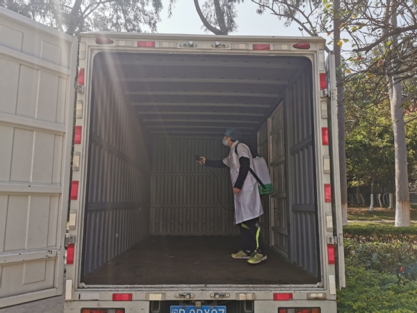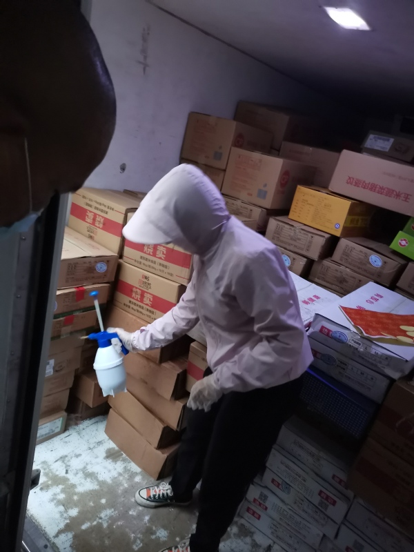 食材到达采购组之后,指定专人对进口冷链食品外包装再次喷洒消毒液进行预防性消毒。