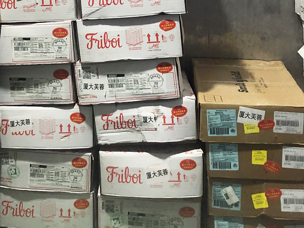 进口冷链食品在采购组及食堂的冻库均由专人对接、专人管理、专位放置、专人收集处理外包装袋。