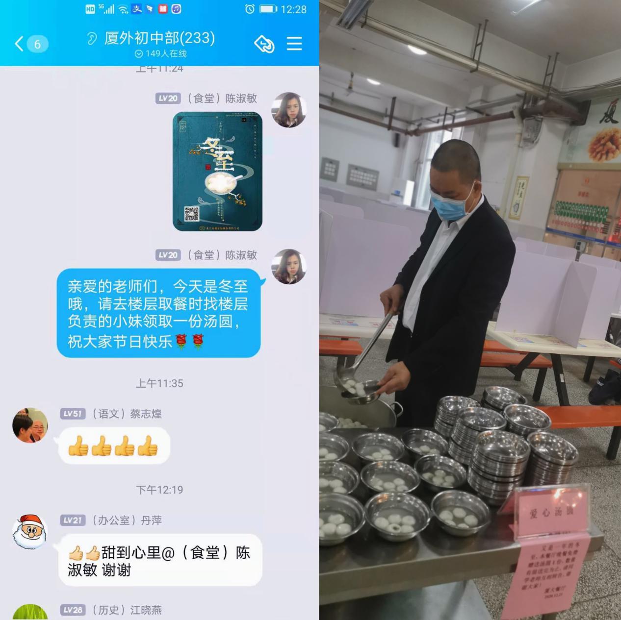 此外,还有外国语学校厦大餐厅、双十中学厦大餐厅、新店中学厦大餐厅、厦门二中厦大餐厅、技师学院厦大餐厅、信息学校厦大餐厅、轮渡厦大餐厅、规划院厦大餐厅等多家学校、企业类餐厅,都为用餐者提供了暖心汤圆,甚至食堂工作人员还为学生“送汤圆上门”;轨道集团东孚餐厅还在汤圆里加入胡萝卜、玉米点缀,为冬至增添一抹温情。