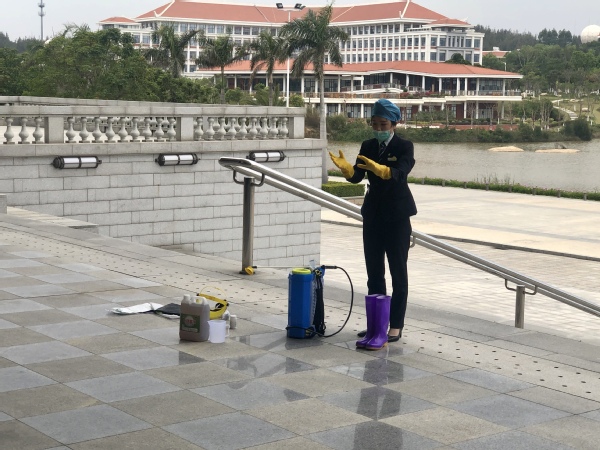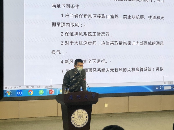 陈翎介绍了新型冠状肺炎病毒的传播途径、不同人群口罩的选择及使用、空调通风系统的运行管理、常用消毒剂的种类,强调了餐厅、校车、超市等重点场所消杀的注意事项。