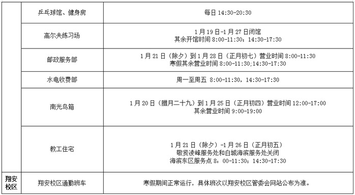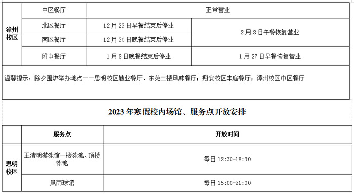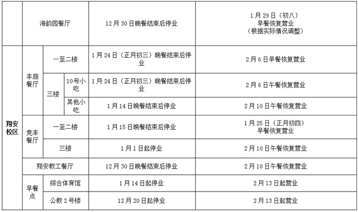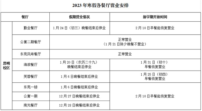 寒假期间,为保障学校工作的开展和基本运行,让师生度过一个安全、祥和、愉快的假期和春节,后勤集团根据学校2023年寒假工作安排,结合工作实际情况,制定寒假期间后勤服务保障工作安排,具体如下: