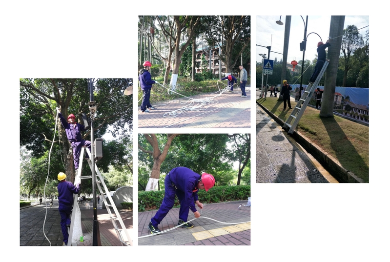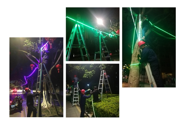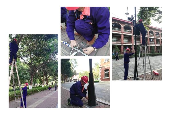 张灯结彩迎新年是中华民族的传统,为了营造出春节的喜庆气氛,水电服务中心用心研讨彩灯布置方案,积极分组分工 落实,全体水电维修师傅分工协作,刺骨寒风中也难挡热情,有的登高拉灯,有的下井布线,日夜加班加点亮化、美化校园。