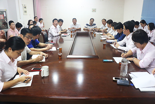 10月23日,后勤集团总经理林公明、党委书记刘立荣、副总经理陈有亮、党委副书记邓泽君、总经理助理汪尚谦,携集团办公室、人力资源部、质监部相关负责人到饮食服务中心调研标准建设和“一流后勤”建设情况。饮食服务中心主任江森民,副主任林琳、王涛、吴韶清,财务部经理吴爱云以及全体二级岗人员参会。