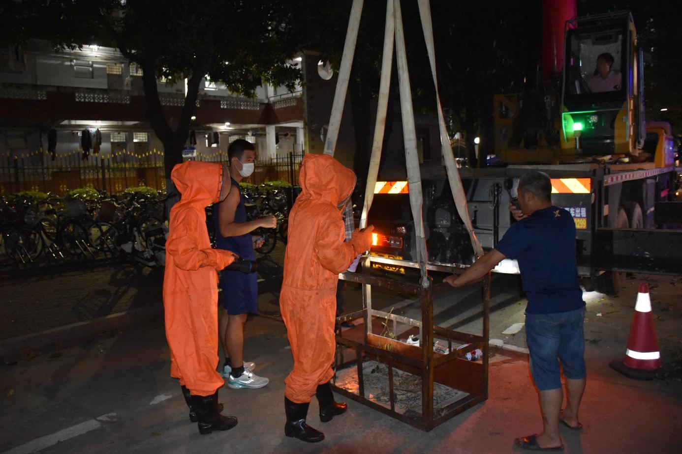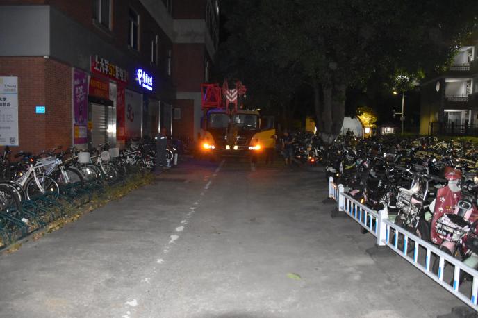 10月11日晚上,待餐厅结束营业以后,中心组织员工暂封芙蓉餐厅至芙蓉隧道处路段,疏散周围师生,同时移除餐厅侧边停放的车辆,以使中心提前调派的吊车能够进入现场作业。