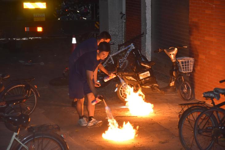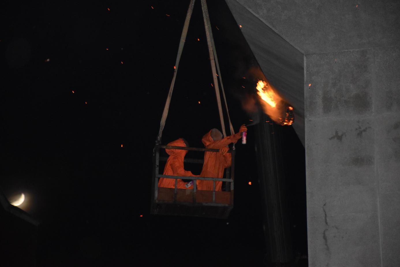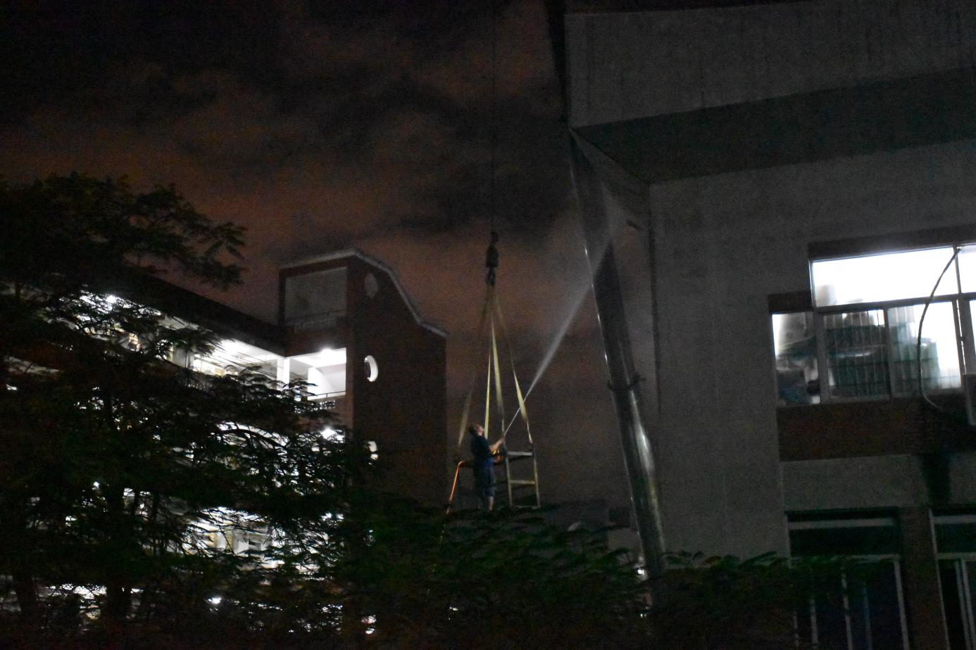 消防员穿戴好防蜂服,利用绳索做好个人安全防护后,搭乘吊车至高空使用“杀虫剂+打火机”对马蜂窝喷射“火舌”。约二十分钟后,巨型马蜂窝被成功摘除。为防止火星复燃及马蜂再次筑巢,中心工作人员再次搭吊车至半空,用高压水枪对残余窝点与附近区域进行喷射,直至蜂患被彻底清除。因当晚风力较大,为高空作业增添了一定难度,整个摘除工作持续了近五十分钟。