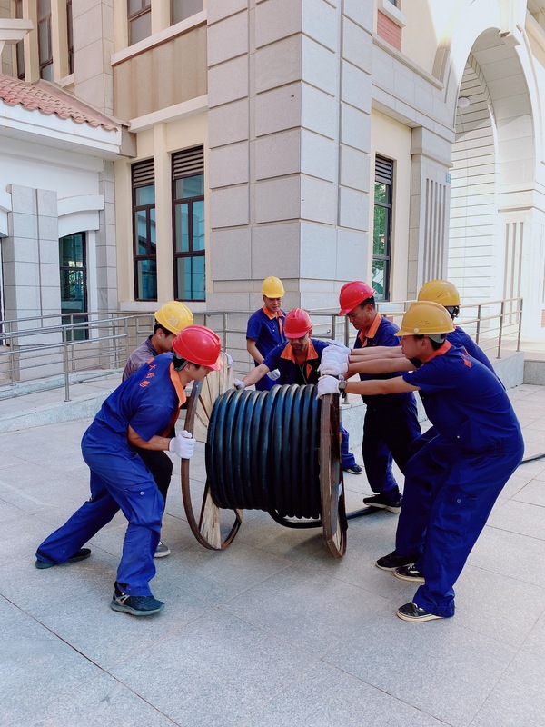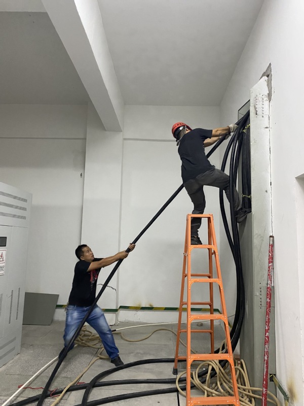 “一、二,拉!”整齐的劳动号子声中,手腕般粗、沉重的黑色电缆在20多个汉子的齐心协力拉拽中一寸一寸地服服帖帖沿着大楼走廊上方天花板上桥架通道由楼栋配电室被牵引到指定地点配电柜中。