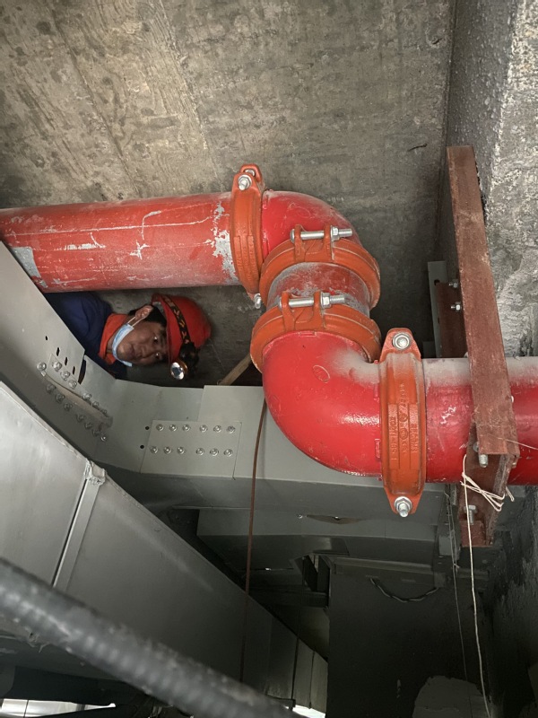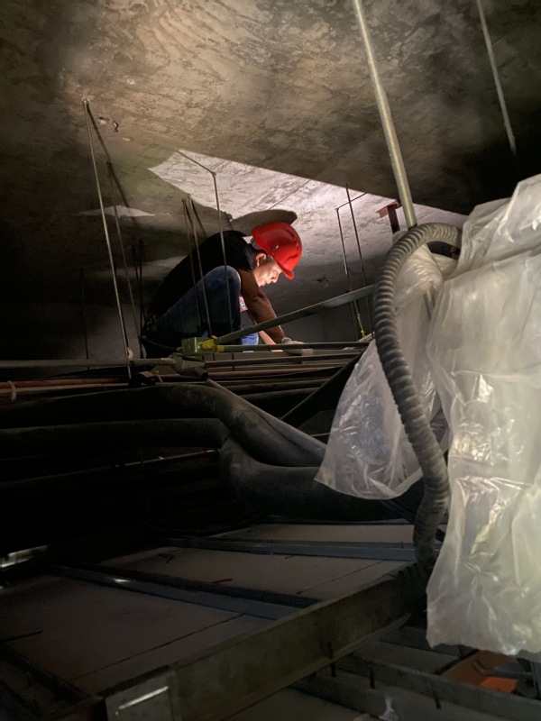 因受到施工现场环境限制,参与施工的水电师傅们只能在走廊天花板上不足1米高的空间中佝偻着身躯,在各自预先布置的转角拐点位齐心协力拉拽电缆。天花板上光线昏暗、密不透风、闷热难当,再加上原有通讯网络线路桥架通道、空调管道、消防管道、通风管道等异物较多、转角弯道多,人工可操作范围狭小,施工难度极大,非常不易,猫在天花板上的师傅们只能一点一点地喊着号子拉拽牵引。中午吃完快餐稍事休息后又投入下午的战斗,时间一点一点过去,整整一天重体力活的劳累,师傅们虽然有些疲惫但斗志不减,天色渐晚,大家仍然咬紧牙关不松紧,坚持加班加点克服重重困难终于在晚上7:00左右完成了两条近700米长的电缆布设。后续,水电管理部员工将继续完成现场恢复、电缆头连接与通电调试工作。