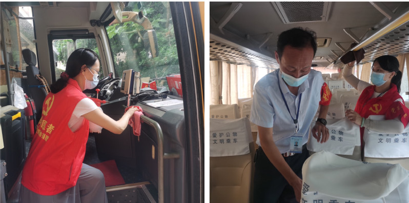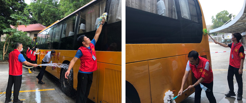 9月23日,运输党支部在思明校区大南车库开展以“学史崇德 弘扬优良传统”为主题的固定党日+活动,齐力做好通勤班车的消毒消杀,保障师生的乘车安全。支部党员、积极分子按照操作流程,分别对车辆外部、行李舱进行清洗,对车辆内部环境进行擦拭和消杀,尤其是车辆扶手、行李架、方向盘等乘客和驾驶员最常接触的部位,做到不留死角。在大家的相互配合下,共完成了6部大客车的清洗和消杀。