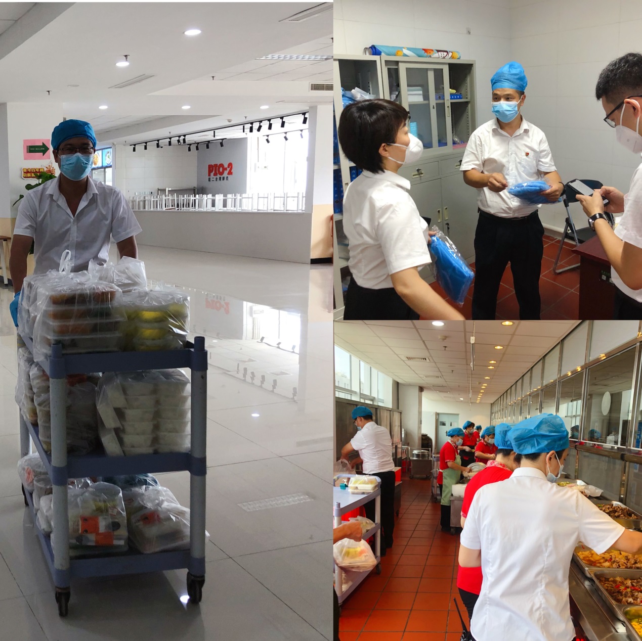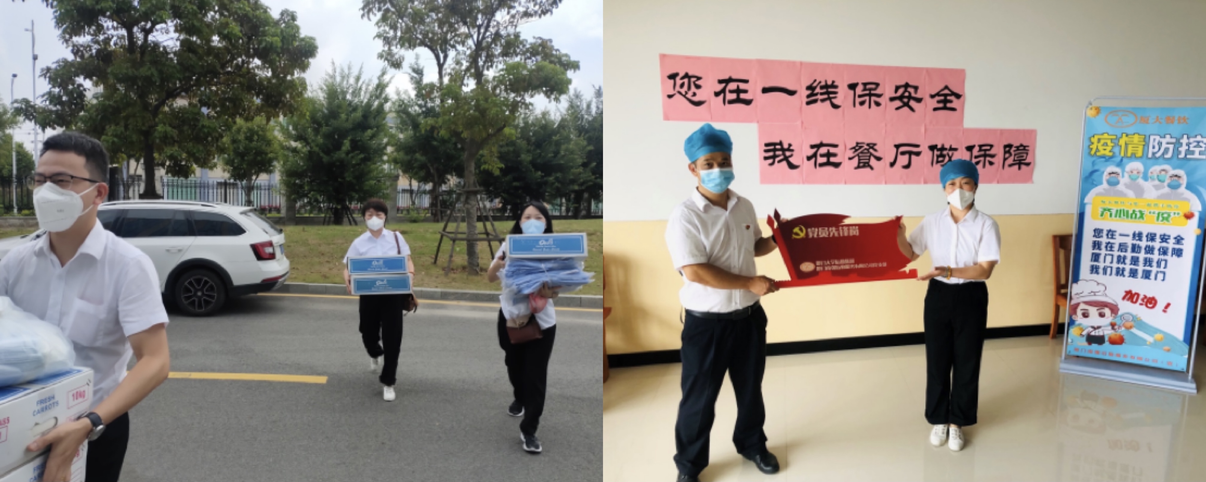 为确保取消校园餐厅堂食服务的取餐现场秩序井然,公司班子成员与餐厅及时应对,出谋划策,第一时间制定打包供餐方案,连夜搬离桌椅、张贴一米线地贴、布置排队窗口与打包餐台。公司办公室与餐厅的党员骨干还加入到校方为社区服务的核酸检测工作中,协助湖里区禾缘社区核酸检测点、梧桐实验学校禾盛社区核酸检测点、思明区鼓浪屿二中的内厝社区核酸检测点秩序维持、体温检测、供餐送餐,以“厦大餐饮人”饱满的精神面貌、高亢的战斗姿态,化身“守护白”、“热血红”、“无畏蓝”,用实际行动保卫校园师生舌尖上的安全。