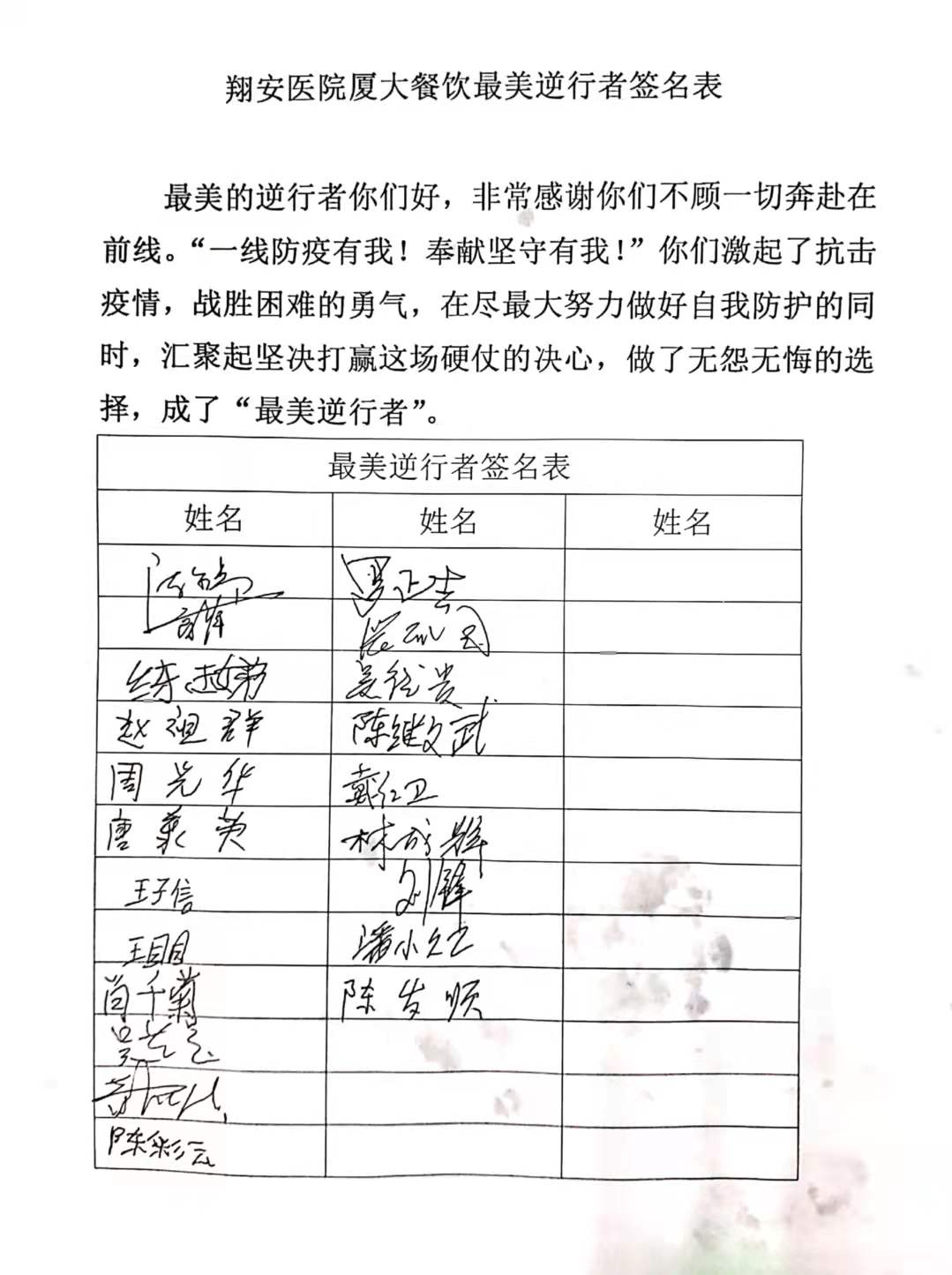 厦门大学附属翔安医院作为定点隔离医院后,餐厅的工作任务与日俱增。每天,餐厅安排专人在做好个人防疫的前提下,为隔离病患定点定时定人送餐;餐厅执行四班倒,除了白天,晚上和凌晨三点、四点还为医护人员提供夜宵与早餐服务,并24小时待命,为需紧急驰援、奔赴一线的医务工作者打包送餐。餐厅20名员工秉承“一线防疫有我,奉献坚守有我”的初心,无怨无悔签下自己的姓名,奔赴在医务工作者后勤保障的前线,他们做好自我防护的同时,也做好随时被隔离在翔安医院内服务供餐一个月的准备,汇聚起坚决打赢这场硬仗的决心。