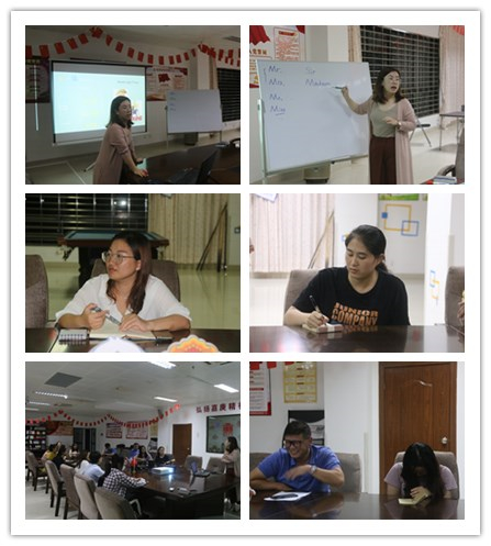 第一节课上,Lina老师通过英语国家人名的构成、称呼、社交文化、礼节禁忌等,引入了日常交际口语中最基本的问候语,详细示范了发音,讲解了同类问候语之间的细微差别,并让学员们模拟场景进行练习。学员们在互动中渐渐打破了哑巴英语的束缚,树立了学习的信心,首次授课培训取得了良好的效果。