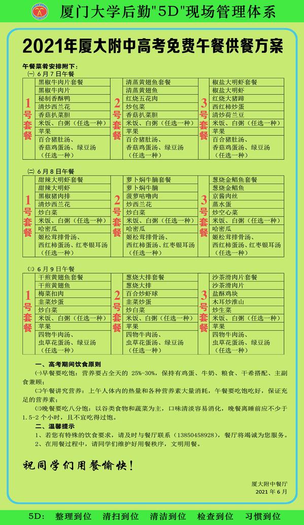 6月7日、8日、9日迎来了全国高考日。厦门大学附属中学餐厅把学习党史同推动工作结合起来,扎实开展“我为师生办实事”实践活动,高标准、高质量落实多项服务举措,为来到附中考点的考生、监考老师提供坚实的后勤保障,做好高考供餐工作。