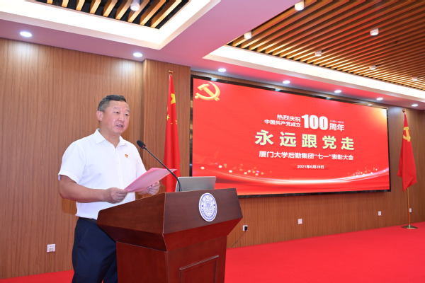 邓朝晖指出,近8年来,后勤集团先后开展“安全生产年”“服务提升年”“文化建设年”“内控建设年”“标准建设年”“人才建设年”“‘5D’建设年”“智慧后勤建设”等年度系列主题活动,圆满完成抗击“莫兰蒂”超强台风、金砖国家领导人厦门会晤、厦门大学百年校庆等一系列重要活动保障,涌现出一批先进党支部和优秀共产党员、优秀党务工作者,他们担当作为、真抓实干、奋发进取、默默奉献,充分发挥了战斗堡垒作用和先锋模范作用,充分展现了最美厦大后勤人的风采,今天受到表彰的同志是他们中的代表。今年开展党史学习教育以来,后勤集团党委结合实际开展“我为师生员工办实事”,列出项目清单12项,青年文明号“户号对接”为“空巢老人”住户提供志愿水电维修服务、精准帮扶担架队为紧急救护的老同志上下楼就医提供应急抬担架服务、“一站式服务大厅”“一日一师一菜”“一人一桶”共享洗衣机推广使用等为师生办实事活动,深受师生欢迎。她代表校党委对后勤集团广大党员提出三点希望:一是立足一流建设,以一流党建引领一流后勤建设;二是深入抓好党史学习教育,推进为师生办实事;三是牢记初心使命,努力争做一名优秀的共产党员。