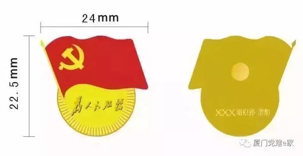 正面上方为中国共产党党旗图案,下方为圆形图案,印有“为人民服务”字样; 背面标注××省(区、市)或××部门(系统)党委组织部监制字样。徽章尺寸为24mm×22.5mm×2mm,材质为锌挂镀仿金。