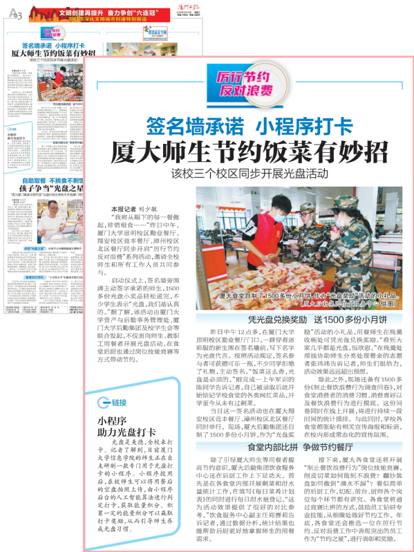 厦门大学“厉行节约 反对浪费”系列活动将有序逐步开展,每一位厦大人将从节约点滴资源做起,树立正确的消费观,杜绝“舌尖上的浪费”,汇聚建设节约型校园的磅礴合力,为继承和发扬勤俭节约的中华民族传统美德贡献力量。