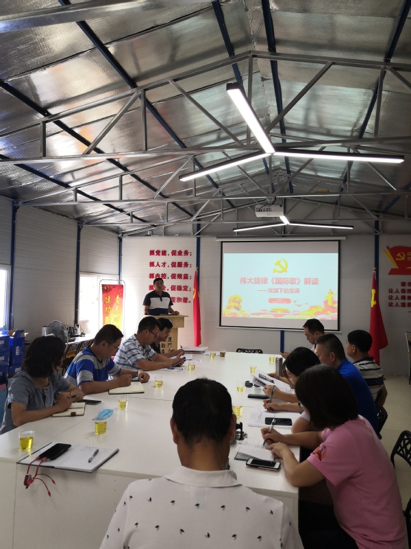 随后,王裕民副总经理给大家带来“党旗下的党课”——《国际歌》解读。他从《国际歌》的诞生背景、思想内涵与教育意义进行分析解读,引导大家要坚持马克思主义真理,在学思践悟中,充分发挥党员先锋模范作用和队伍凝聚力,以党建为引领,为保障学校疫情防控常态化和水电、运输安全构筑一道“红色防火墙”。