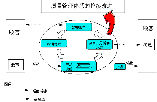 图1所反映的以过程为基础的质量管理体系模式展示了4~8章中所提出的过程联系。这种展示反映了在规定输入要求时,顾客起着重要作用。对顾客满意的监视要求对顾客有关组织是否已满足其要求的感受的信息进行评价。 该模式虽覆盖了本标准的所有要求,但却未详细地反映各过程。