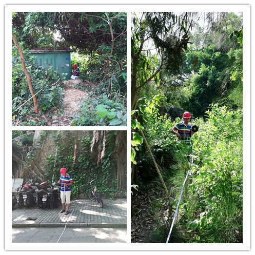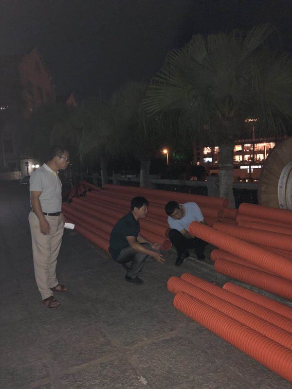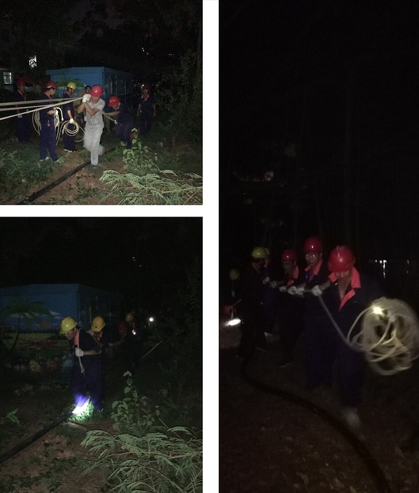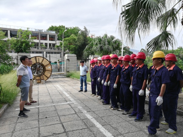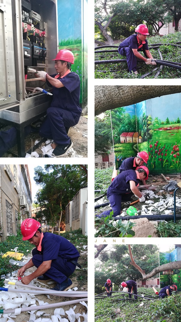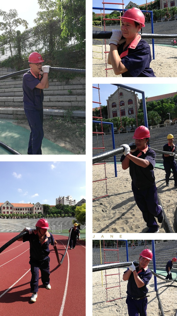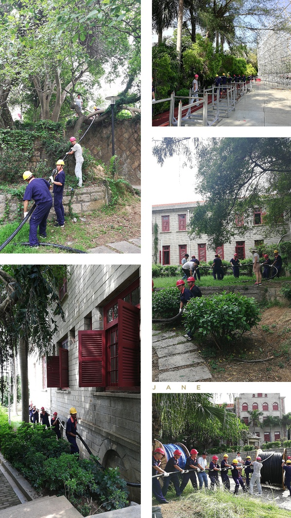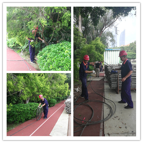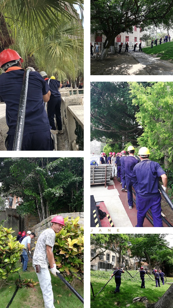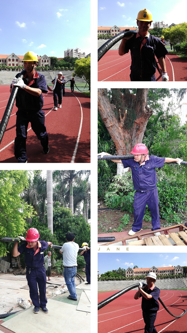 为在预定时间内完成电缆铺设任务,水电维修师傅们披星戴月,不辞辛劳,紧握电缆铆足了劲,齐心协力往同一个方向拉,一寸寸一步步,将手臂粗的沉重电缆铺设在校园内。