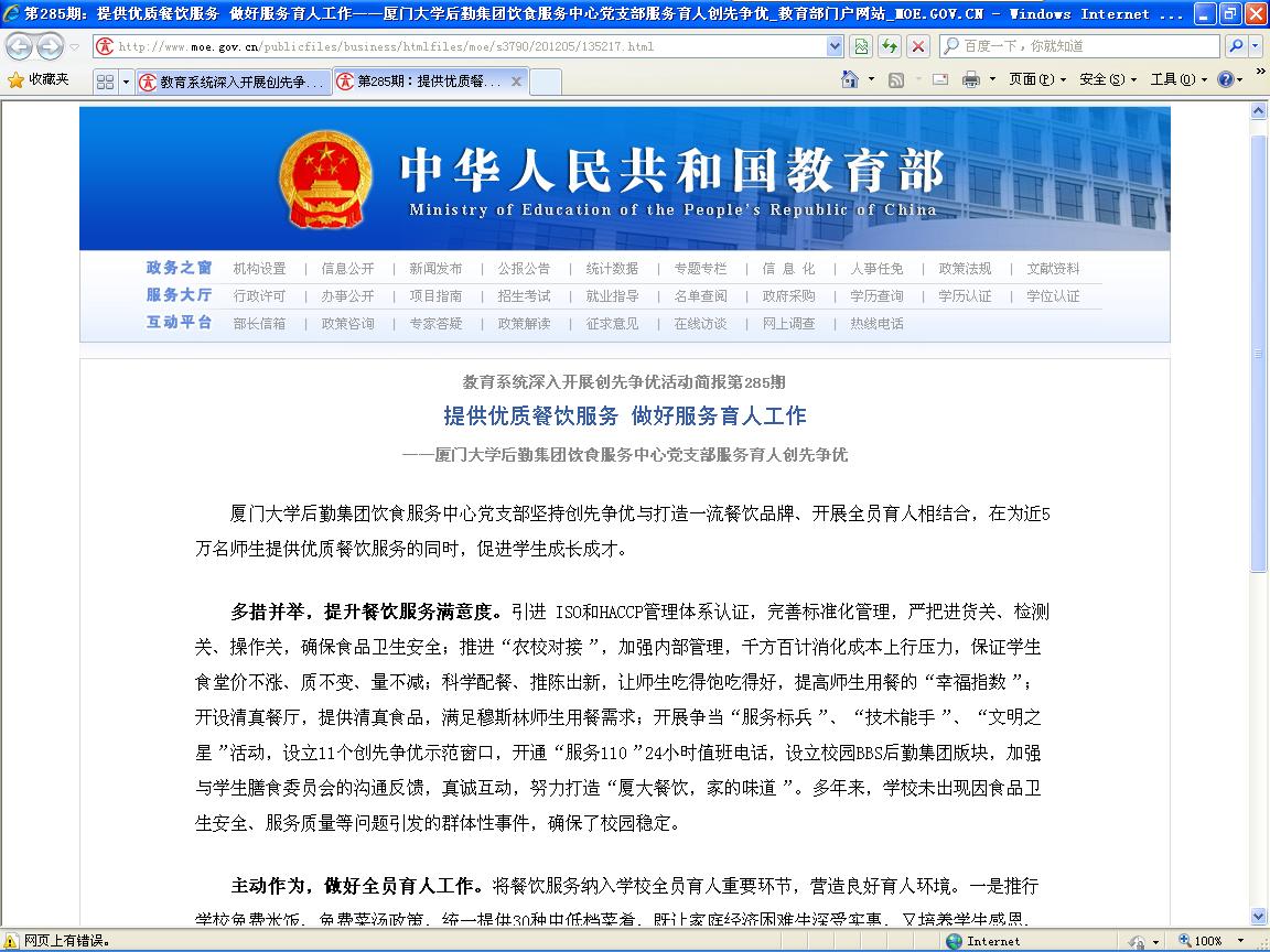 多措并举,提升餐饮服务满意度。引进 ISO和HACCP管理体系认证,完善标准化管理,严把进货关、检测关、操作关,确保食品卫生安全;推进“农校对接”,加强内部管理,千方百计消化成本上行压力,保证学生食堂价不涨、质不变、量不减;科学配餐、推陈出新,让师生吃得饱吃得好,提高师生用餐的“幸福指数”;开设清真餐厅,提供清真食品,满足穆斯林师生用餐需求;开展争当“服务标兵”、“技术能手”、“文明之星”活动,设立11个创先争优示范窗口,开通“服务110”24小时值班电话,设立校园BBS后勤集团版块,加强与学生膳食委员会的沟通反馈,真诚互动,努力打造“厦大餐饮,家的味道”。多年来,学校未出现因食品卫生安全、服务质量等问题引发的群体性事件,确保了校园稳定。