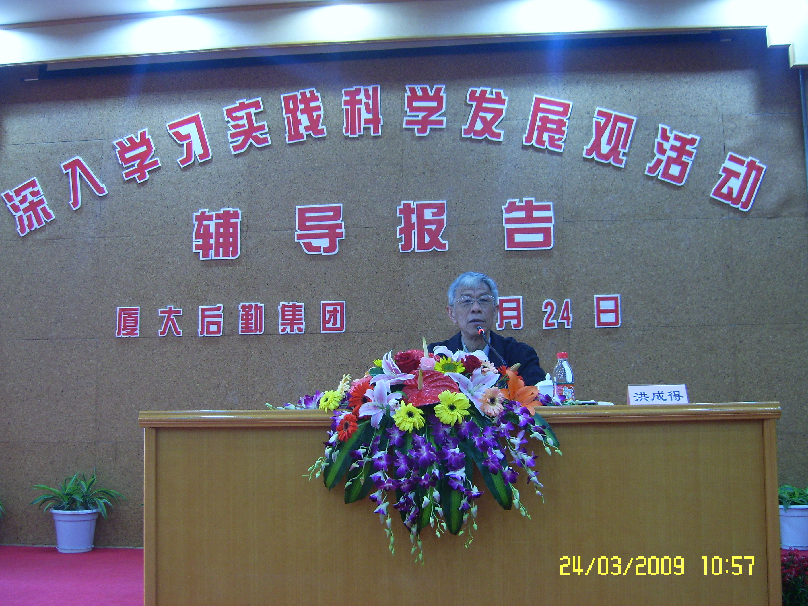 3月24日上午9时30分,后勤集团在克立楼报告厅举行深入学习实践科学发展观活动第二场辅导报告会。校学习实践活动理论报告员、人文学院洪成得教授为与会人员作了题为《关于学习实践科学发展观活动需要解决的若干问题》的精彩报告。集团学习实践活动领导小组成员、全体党员、入党积极分子、集团二级管理骨干以上人员、首届职代会代表、民主党派人士约250人认真聆听了报告。报告会由党总支书记叶鹏飞主持。