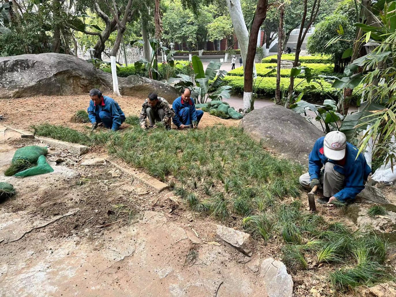 科学规划,成就校园美景。毛杜鹃浪漫似锦,浓艳花多,叶丛翠绿,山樱花花色瑰丽、树形优美,麦冬四季常绿,校园花红柳绿,这些丰富多彩的苗木构成了校园内优美的景观。绿化保洁部通过现场排查、组织论证,遵循科学性、艺术性,制定了详细的补栽补种计划,选择适宜存活的绿化苗木进行补植补栽,对裸土现象、缺株景观进行修复,对特色景点进行提质改造,重点对芙蓉湖、大礼堂、群贤路和主楼群等的周边区域进行改良土质、苗木地被补植、草坪复绿,同时引进苏州沿阶草对自钦楼、人类博物馆、芙蓉湖周边树穴等进行栽种,将原本鹅卵石铺设的树穴改为地被,大大提高了观赏性。