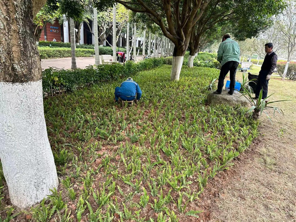 提前动员,全面摸清“家底”。新学期伊始,绿化保洁部开展绿化专题研讨会,部署思明校区绿化摸查工作,要求对各片区裸露、缺株断垄情况详细统计,做到了如指掌。中心领导与学校资产处领导多次沟通,实地巡查,严把时间节点,从信息梳理到立项派工,从施工监管到完工验收,整个流程一丝不苟,确保了补栽补种的质量。