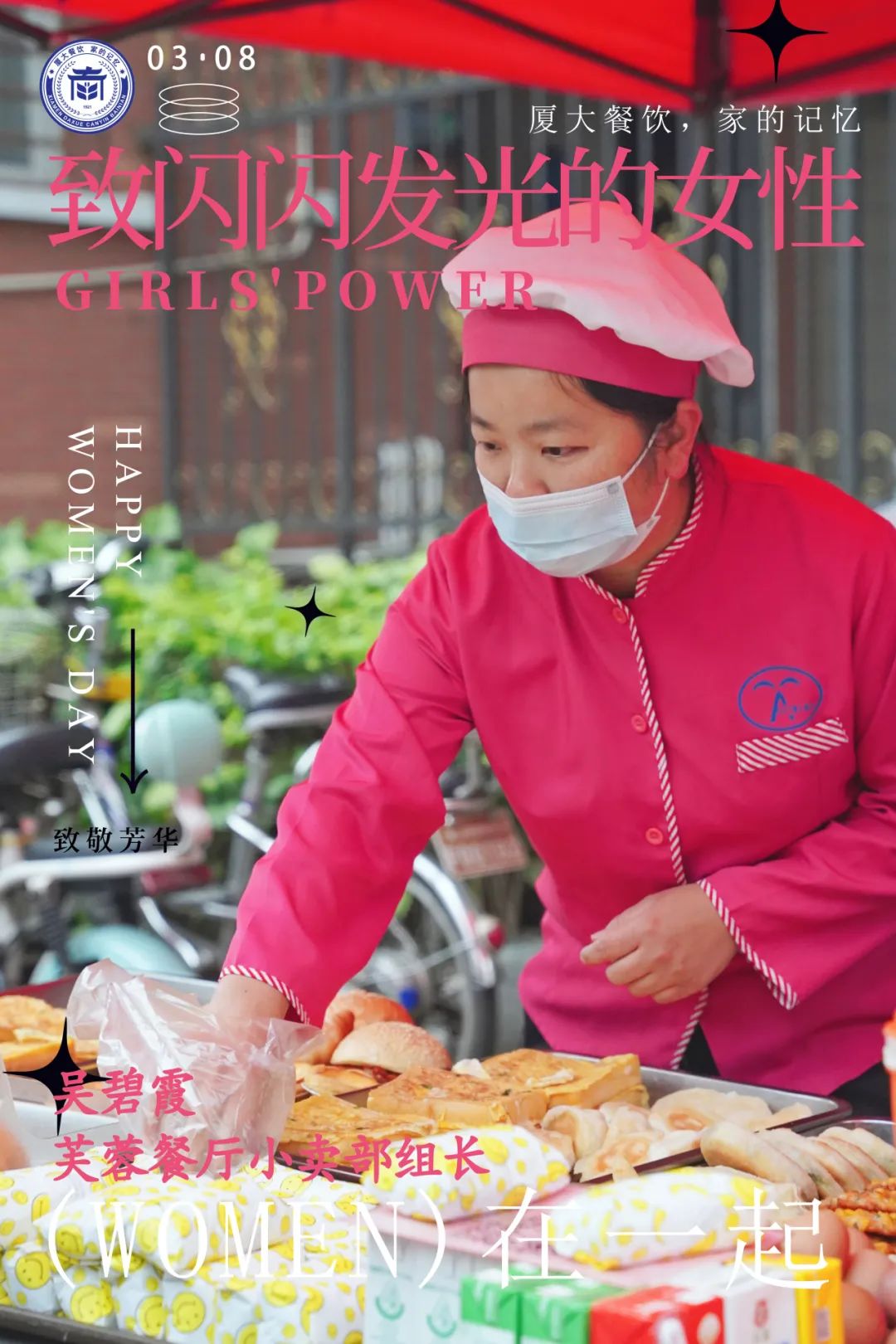 她十年如一日地保持着对工作的敬业和专注,黎明便开始一天的工作。她对待工作一丝不苟,对待师生热情、专业、细致。每天在芙蓉餐厅的户外早餐点,“你好同学,想要吃点什么?”热情流畅的招呼声伴随热气腾腾的早餐,直暖到同学心窝里,开启厦园美好的一天。