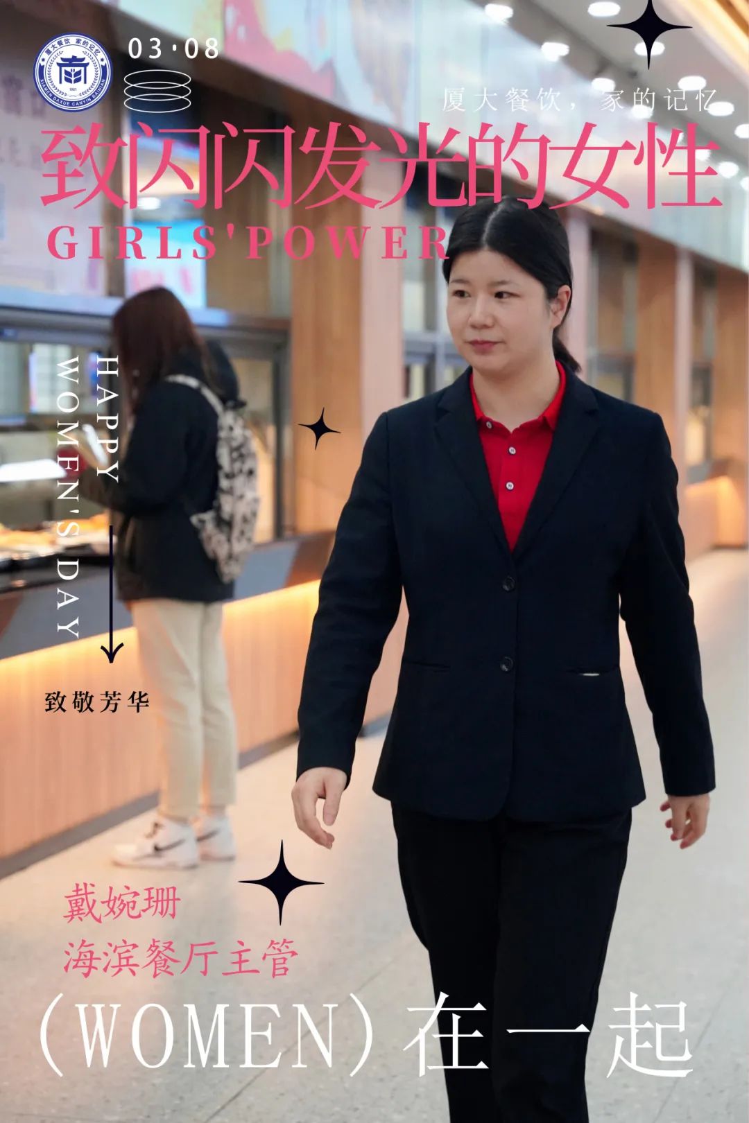 她是餐厅经理的得力助手,协调团队、分配工作、处理突发情况,高效完成任务。她友好耐心地处理同学建议和反馈,给出最合适的解决方案,营造出和谐的用餐氛围。“道阻且长,行则将至;行而不辍,未来可期”,她将秉持着人生信条,和餐厅一起迎接更加美好的未来。