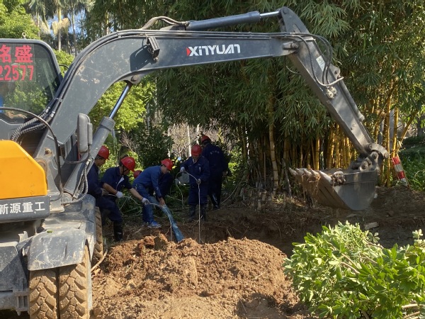 由于该供水管网布设系学校2005年实施的水网改造,已运行18年之久,破损处位于地下2米左右,该区域土质以沙石居多,开挖难度大,加之地下管网交错情况复杂、破损处为特殊弯头,这些问题加大了维修难度。