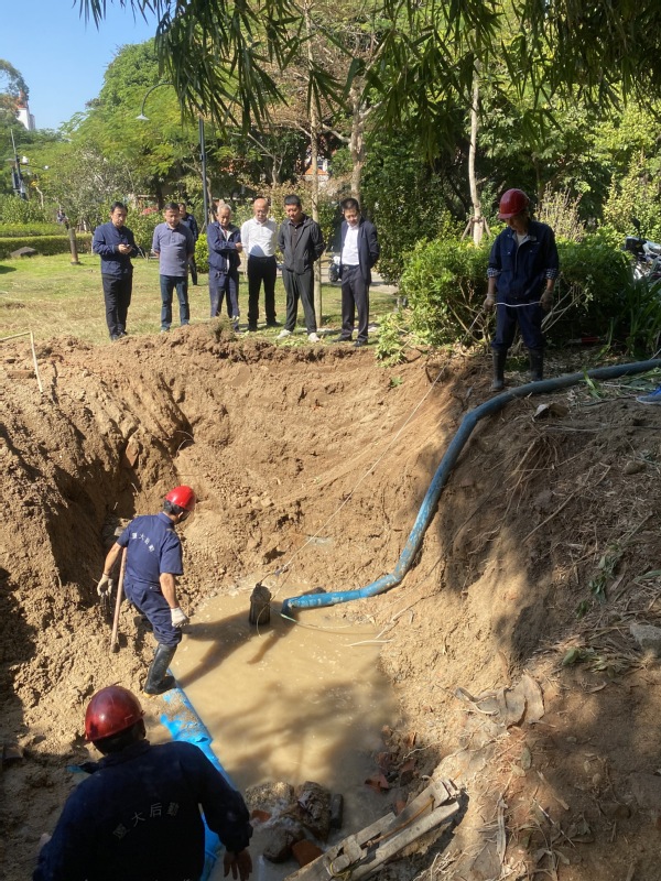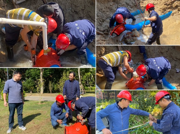 11月21日上午,水电服务中心接报地下井边出现漏水点,经现场开挖、反复认真查勘,发现是地下井泵房输往教工住宅区的主水管(管径250)弯头接缝处老化引起的漏水。因供水涉及片区较大,为最大限度降低对师生正常用水的影响,中心和学校资产与后勤事务管理处水电气管理科针对漏损状况进行分析判断,并现场制定应急抢修方案,迅速集结人员准备设备管材、清理施工现场、展开紧急抢修。