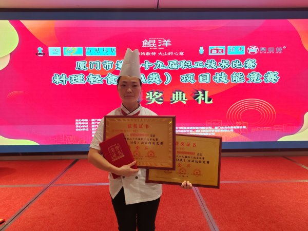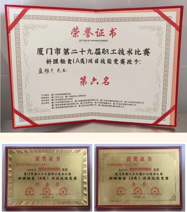 蓝雅兰斩获厦门市第二十九届职工技术比赛料理轻食 (A类) 项目技能竞赛特金奖及金奖,并获得本次竞赛第六名的好成绩。
