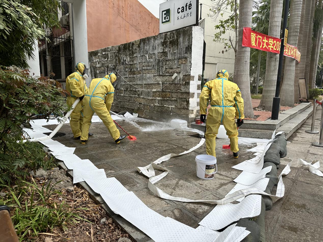 此次演练场景是化学化工学院发生废有机溶剂泄漏着火事故,为保障校园安全,启动学院级应急预案组织处理。中心绿化保洁部主要参与了第二阶段,场景是泄漏液靠雨水井较近,部分泄露液已流入雨水沟,化学化工学院请求校应急办支援,学校应急办接到请求后,启动校级应急响应。中心抢险救援队接到任务后进行紧急抢险。抢险救援人员穿戴防护服后,用充气堵囊封堵雨水井排放口,铺设应急水袋,用消防栓冲洗地面,将流入雨水井内的有机废液及洗消废水抽至应急水袋内。待雨水井中泄漏液和洗消废水已全部抽至应急水袋,地面泄漏液也清理完毕,应急抢险任务圆满完成。