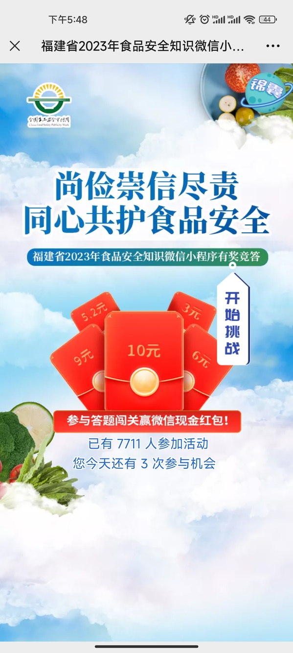 饮食服务中心联合校工会、校团委,广泛组织师生员工参与由省食安办主办、东南网微信公众号举办的食品安全知识微信小程序有奖竞答,进一步加强师生员工对食品安全的认识,提高食品安全意识和自我保护能力。