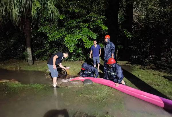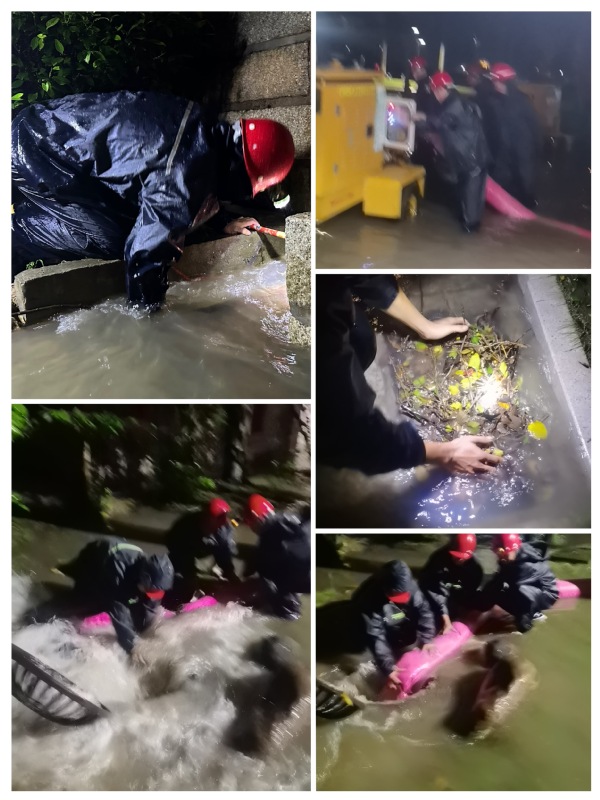 现场水流湍急,水电维修师傅们分工协作,或转运抽水机、或徒手清理排水口杂物,经过1个多小时奋战,于凌晨5点左右排除险情