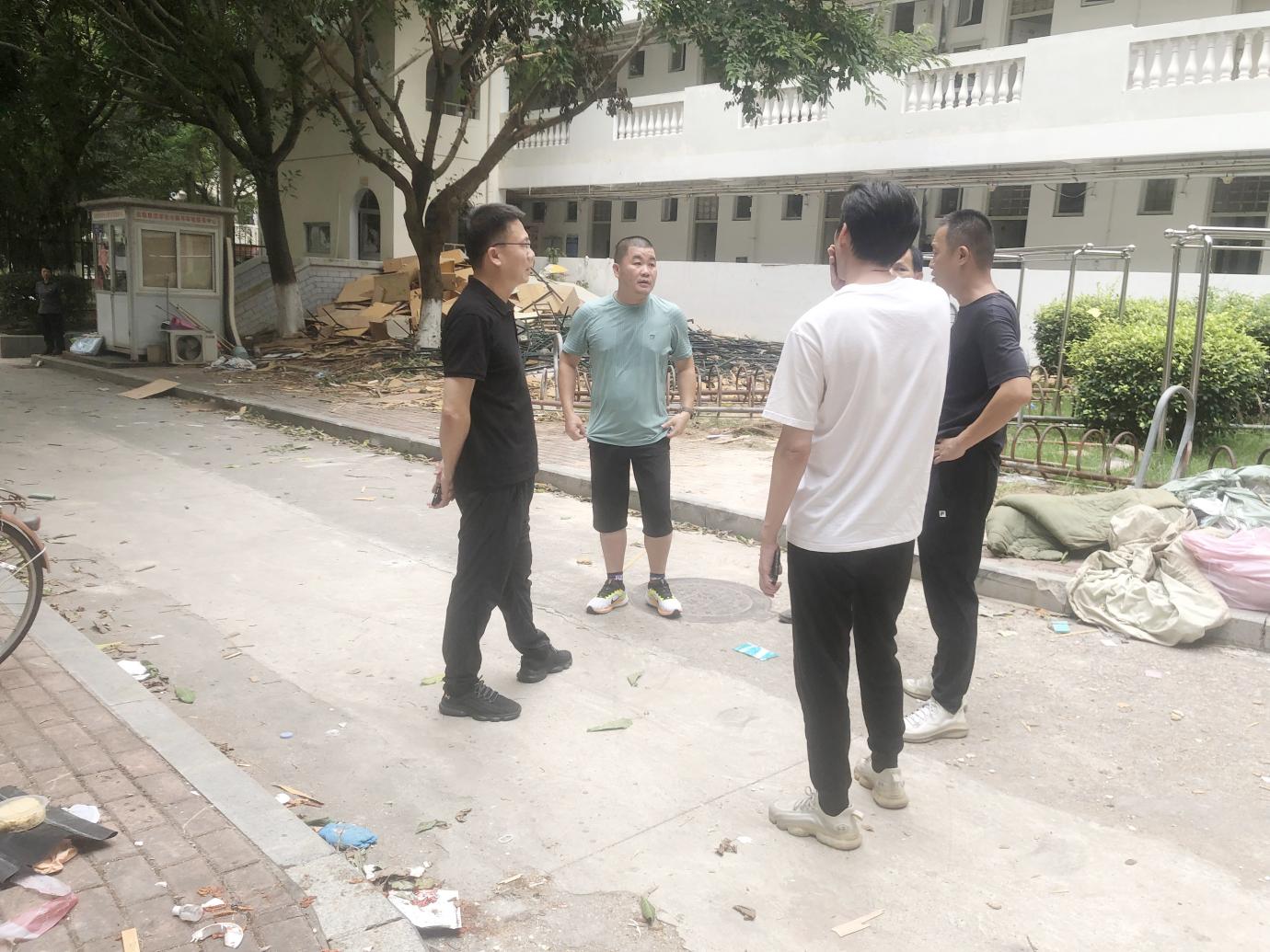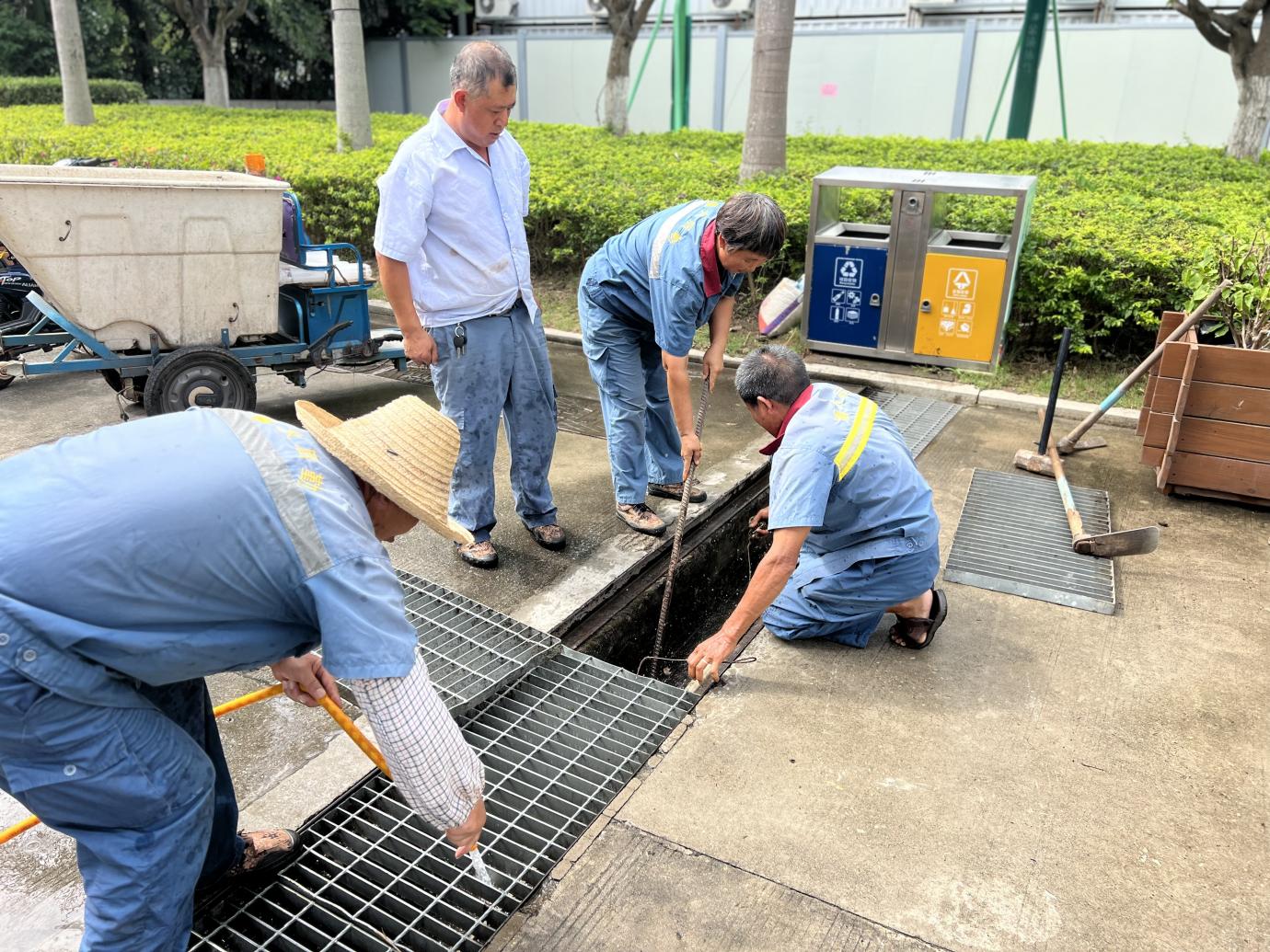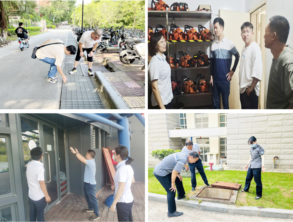 集团副总经理李启忠和中心班子成员带队到校园各个防汛重点区域进行检查。中心各部门迅速行动,做好防汛物资储备、风险隐患排查、应急队伍值守安排等各项工作,并组织员工对防汛重点区域和部位加强巡查,及时疏通排水沟、下水管道,保障排水畅通,同时清理枯枝死树、加固苗木支撑架,确保师生生命财产安全和出行畅通安全。